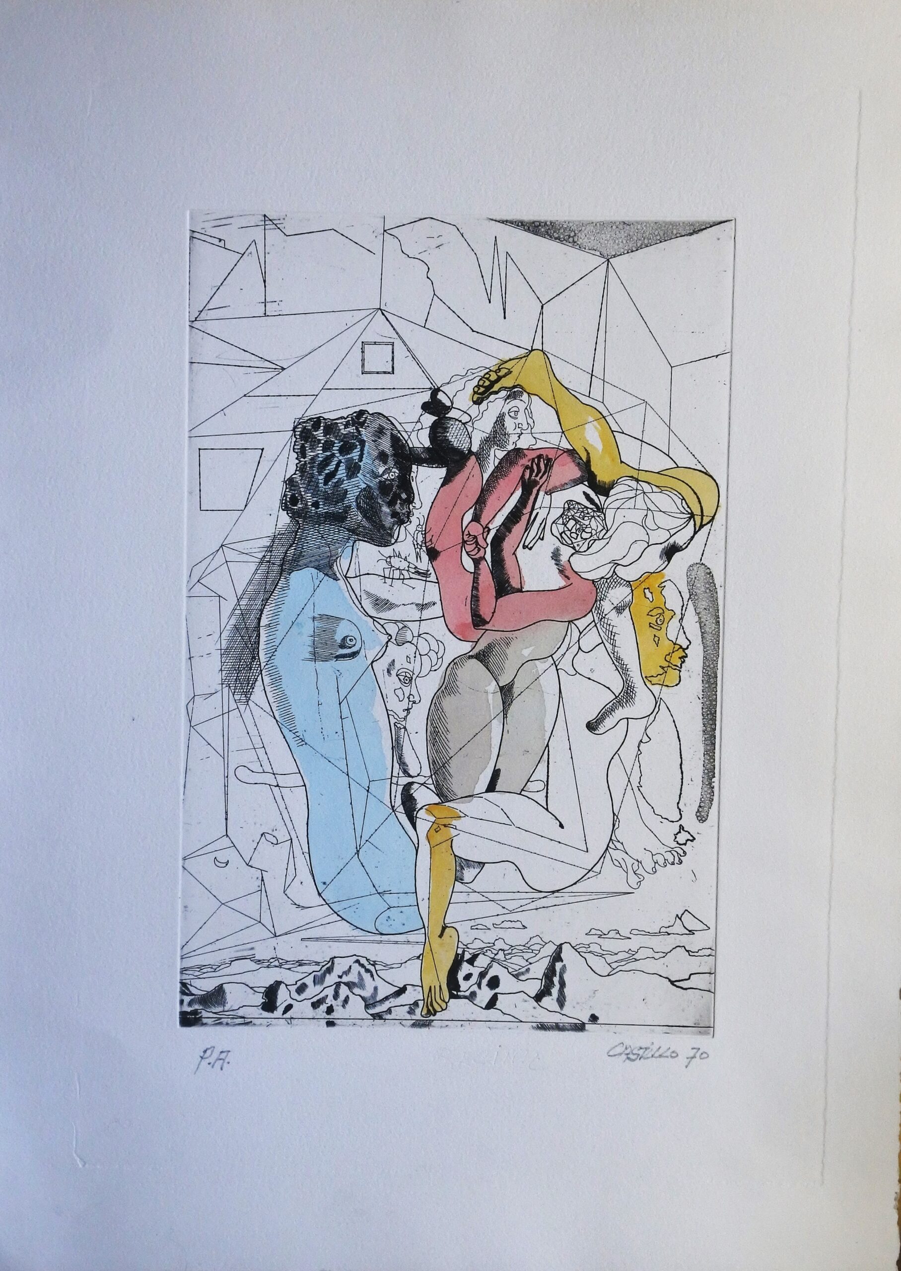Jorge Castillo, Ingravidez, grabado aguafuerte, numerado p. a., datado 70 y firmado a lápiz, phancha 29,50×19 cms. y papel 45×33 cms.