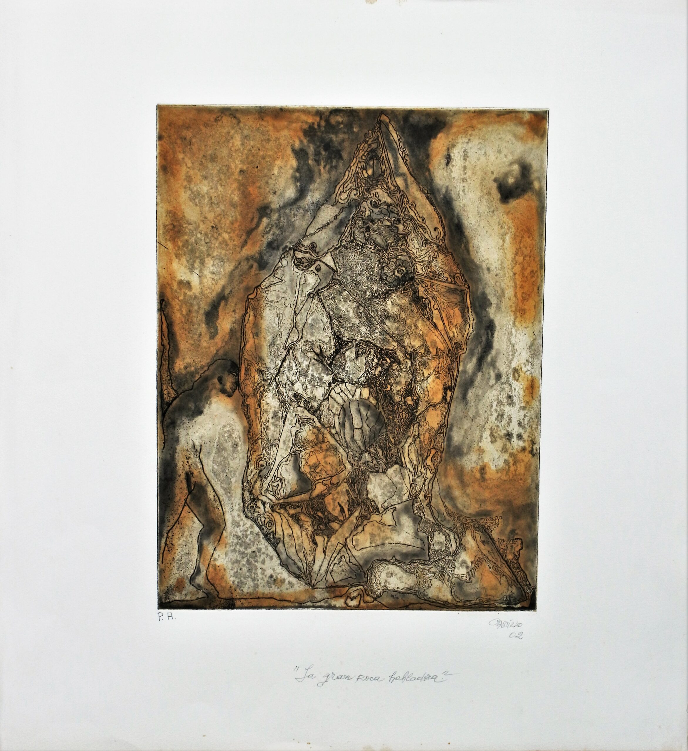 Jorge Castillo, La gran roca habladora, grabado aguafuerte, edición 60 ejemplares, numerado p.a., titulado, datado 02 y firmado a lápiz, plancha 43×33 cms. y papel 65×61 cms.
