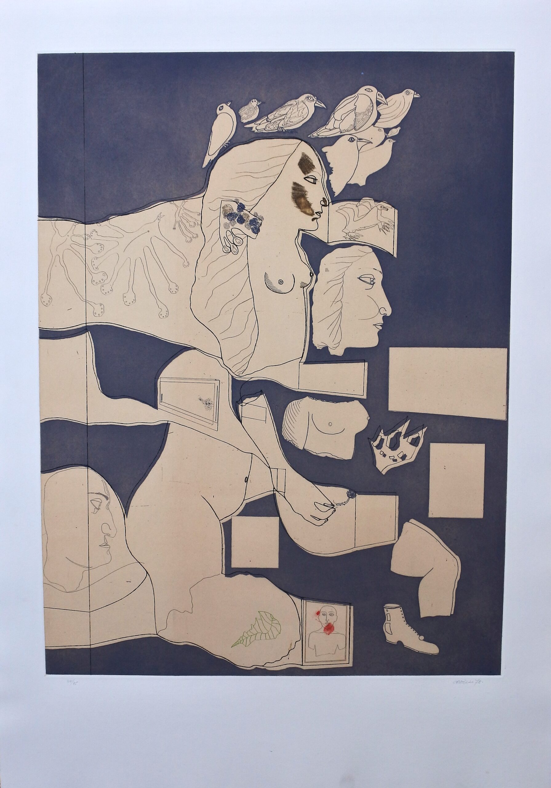 Jorge Castillo, Marienza recortada, grabado aguafuerte, edición 75 ejemplares, numerado, datado 78 y firmado a lápiz, plancha 76×57 cms. y papel 100×70 cms.