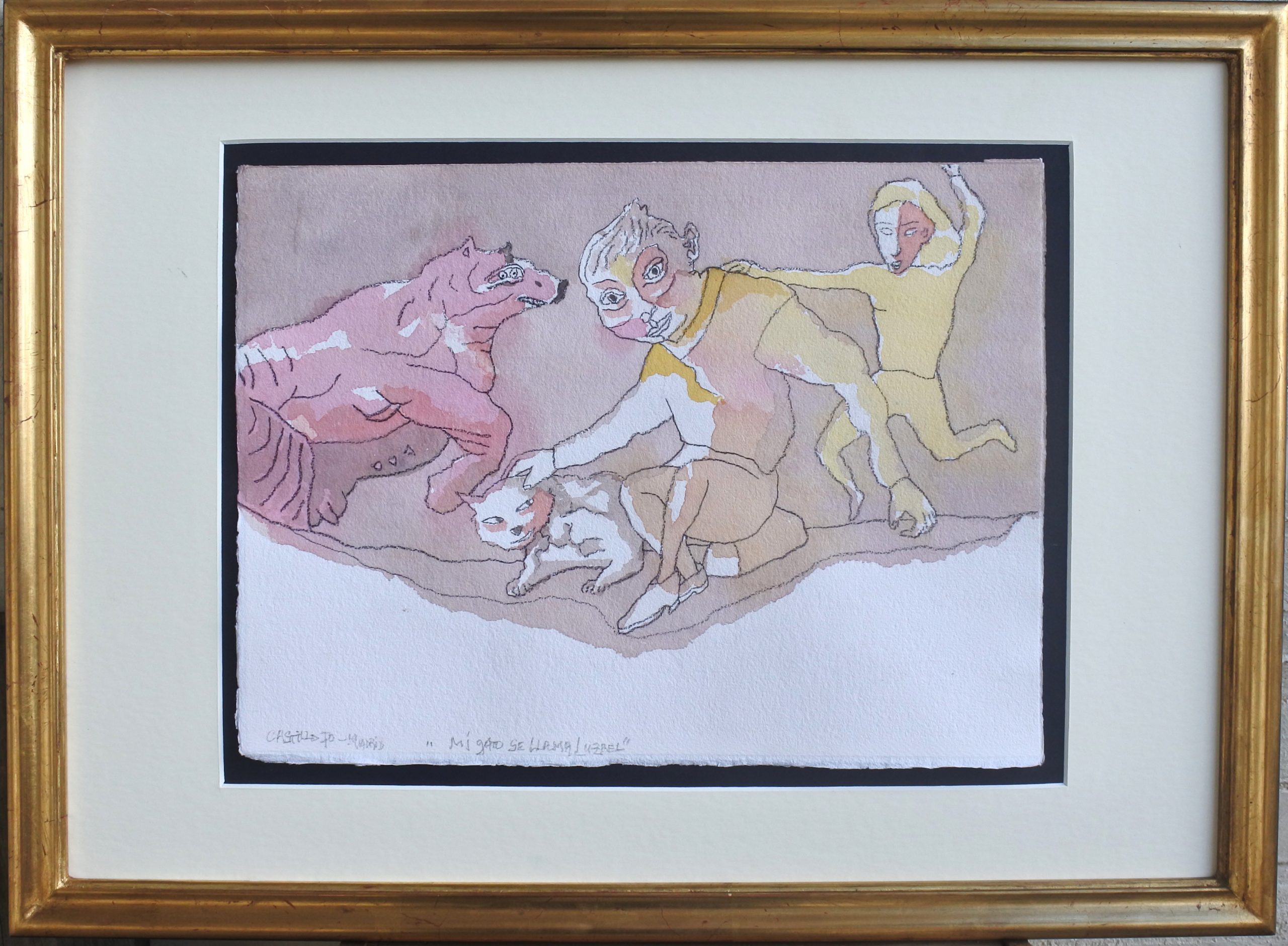 Jorge Castillo – «Mi gato se llama Luzbel» dibujo técnica mixta cartulina, titulado y firmado a lápiz, enmarcado