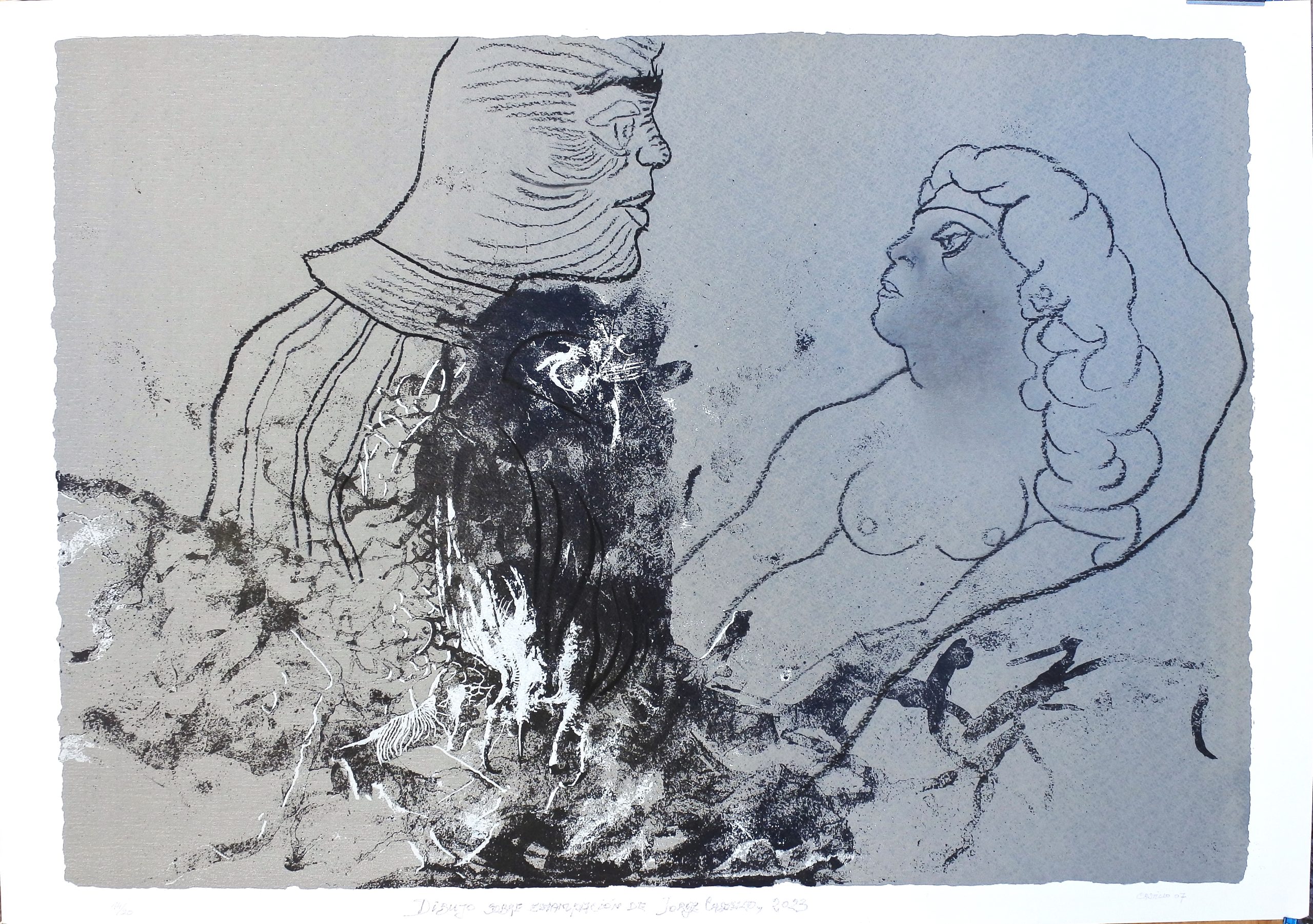 Jorge Castillo, Pareja amorosa, dibujo original sobre estampación litográfica, firmado a lápiz por el autor, 70×100 cms.