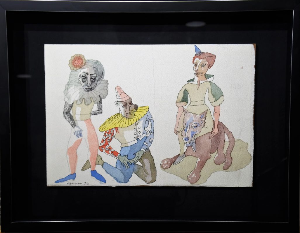 Jorge Castillo, Payaso del circo y su familia, dibujo tinta y acuarela papel pegado a tabla, enmarcado, dibujo 22×32 cms. y marco 34×44 cms.
