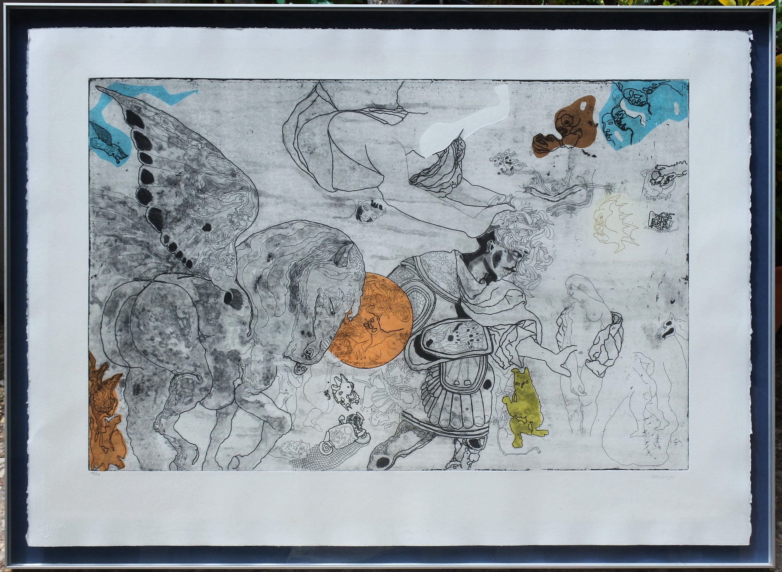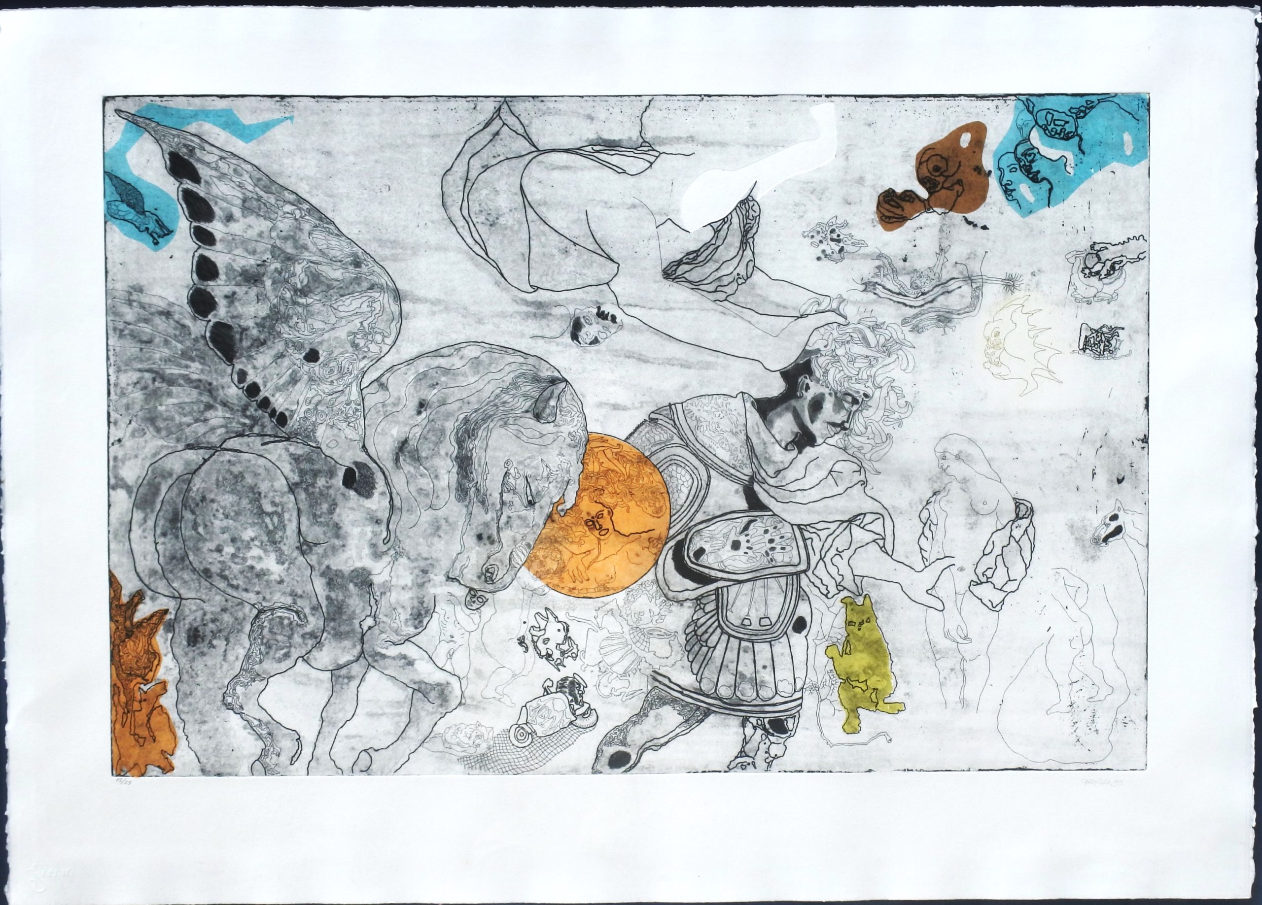 Jorge Castillo, Perseo, grabado aguafuerte, edición 55 ejemplares, numerado, datado 93 y firmado a lápiz, enmarcado, plancha 57×88 cms. papel 75×105 cms. y marco 82×112 cms.