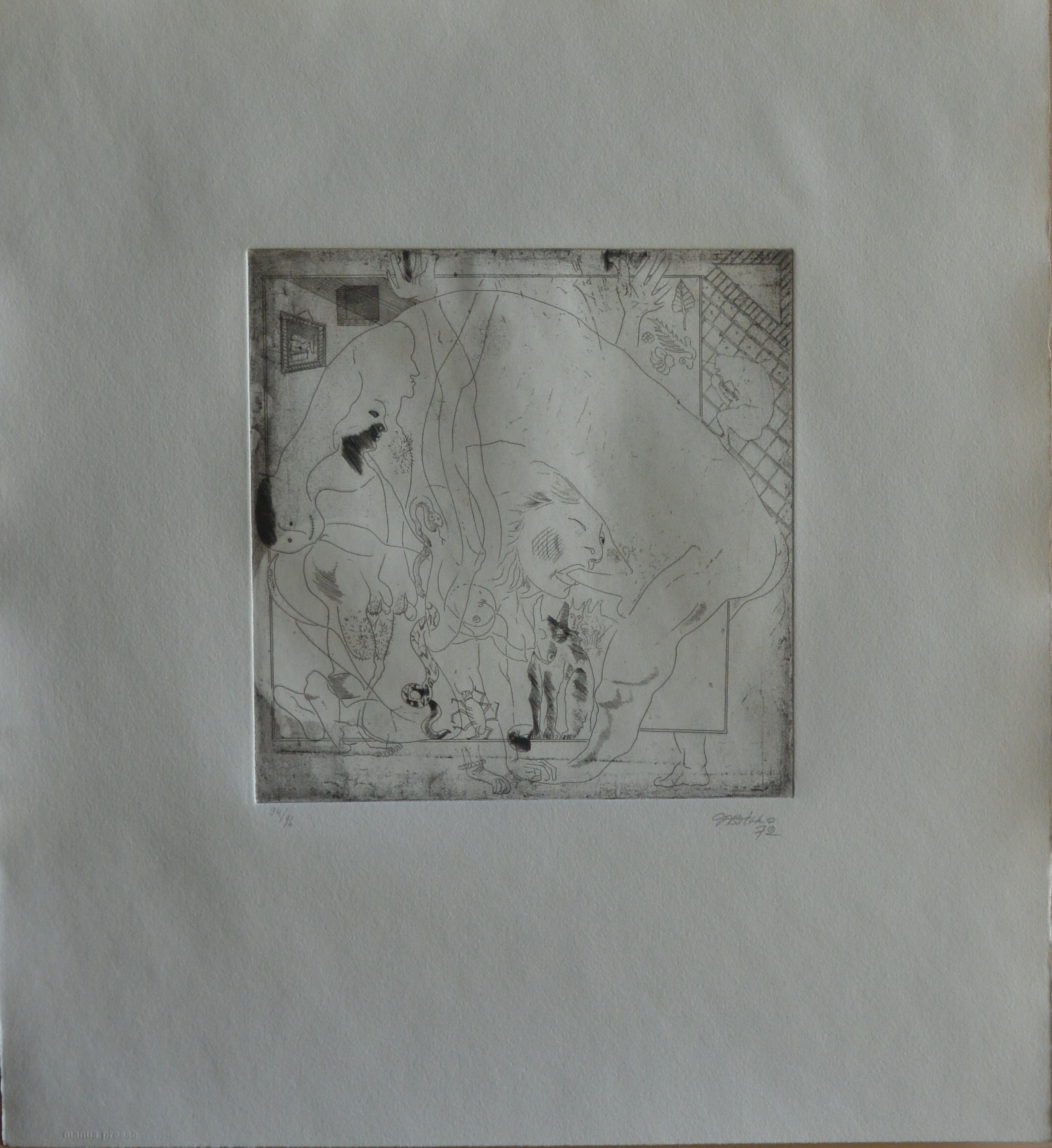 Jorge Castillo, Pornographismo IV, Grabado aguafuerte edición 96 ejemplares, numerado y firmado a lápiz en 1972, papel 41×38 cms. y plancha 19×19 cms.