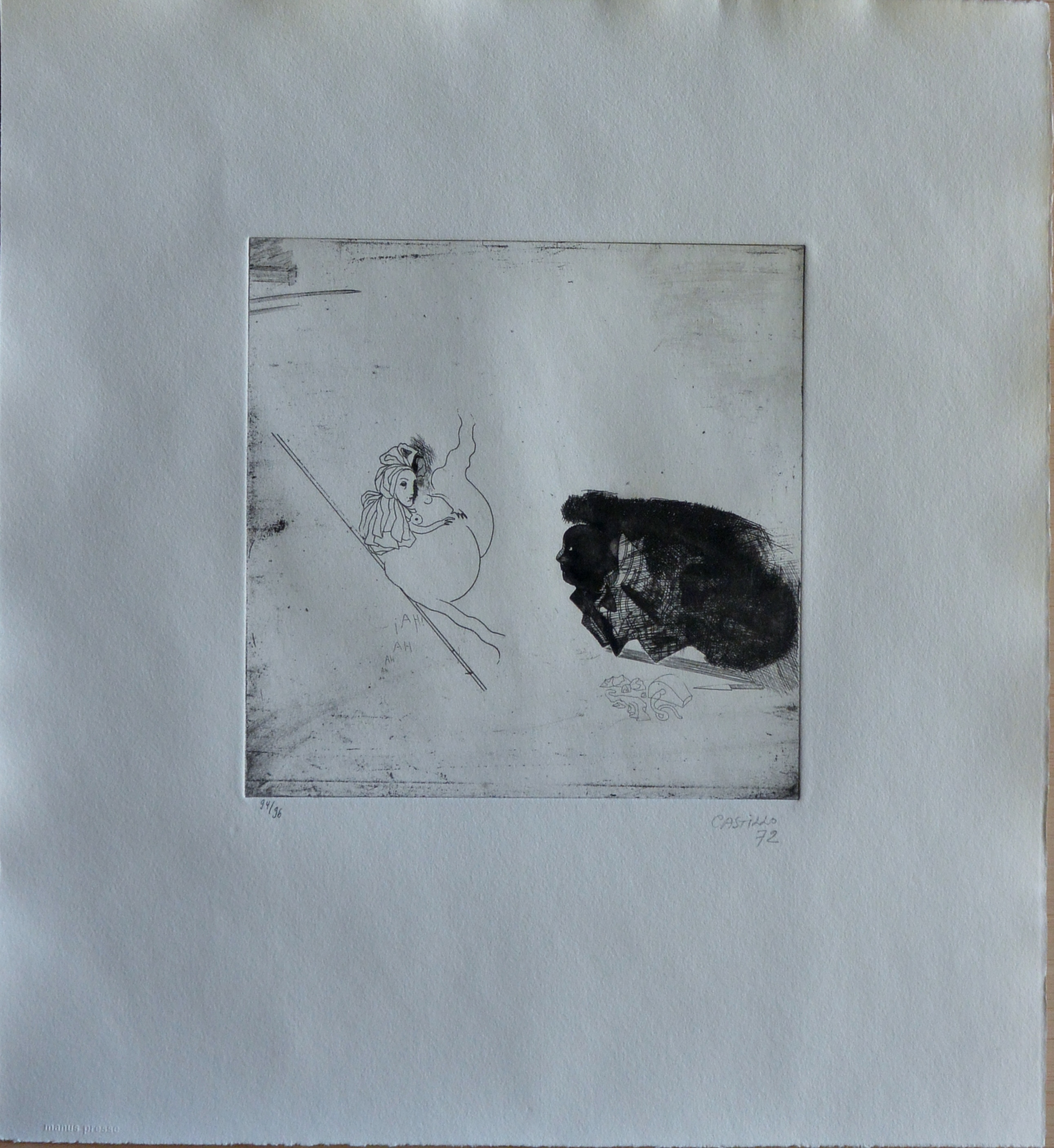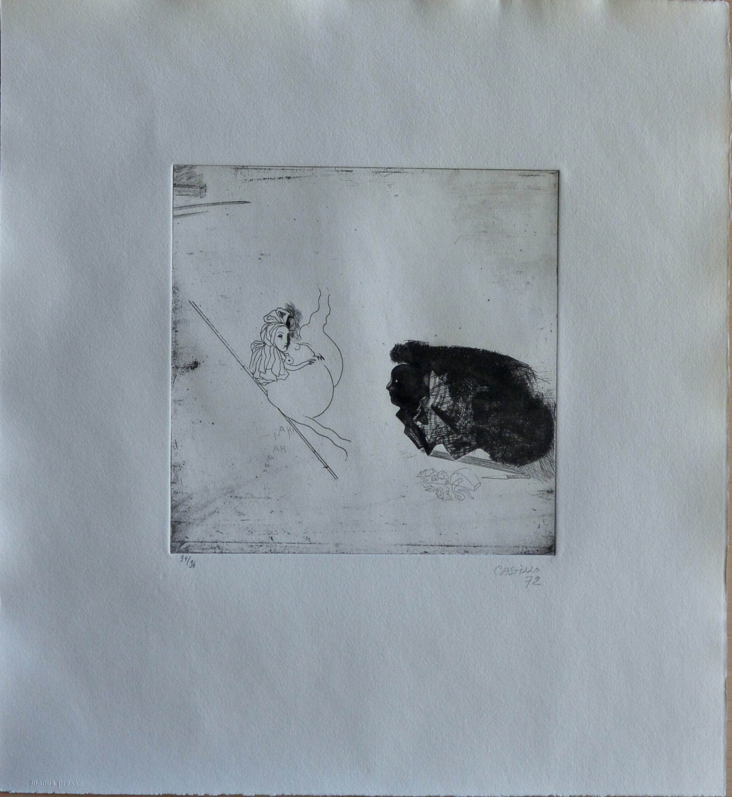 Jorge Castillo, Pornographismo VIII, Grabado aguafuerte, numerado y firmado a lápiz en 1972, papel 41×38 cms. y plancha 19×19 cms.