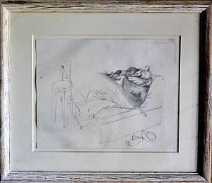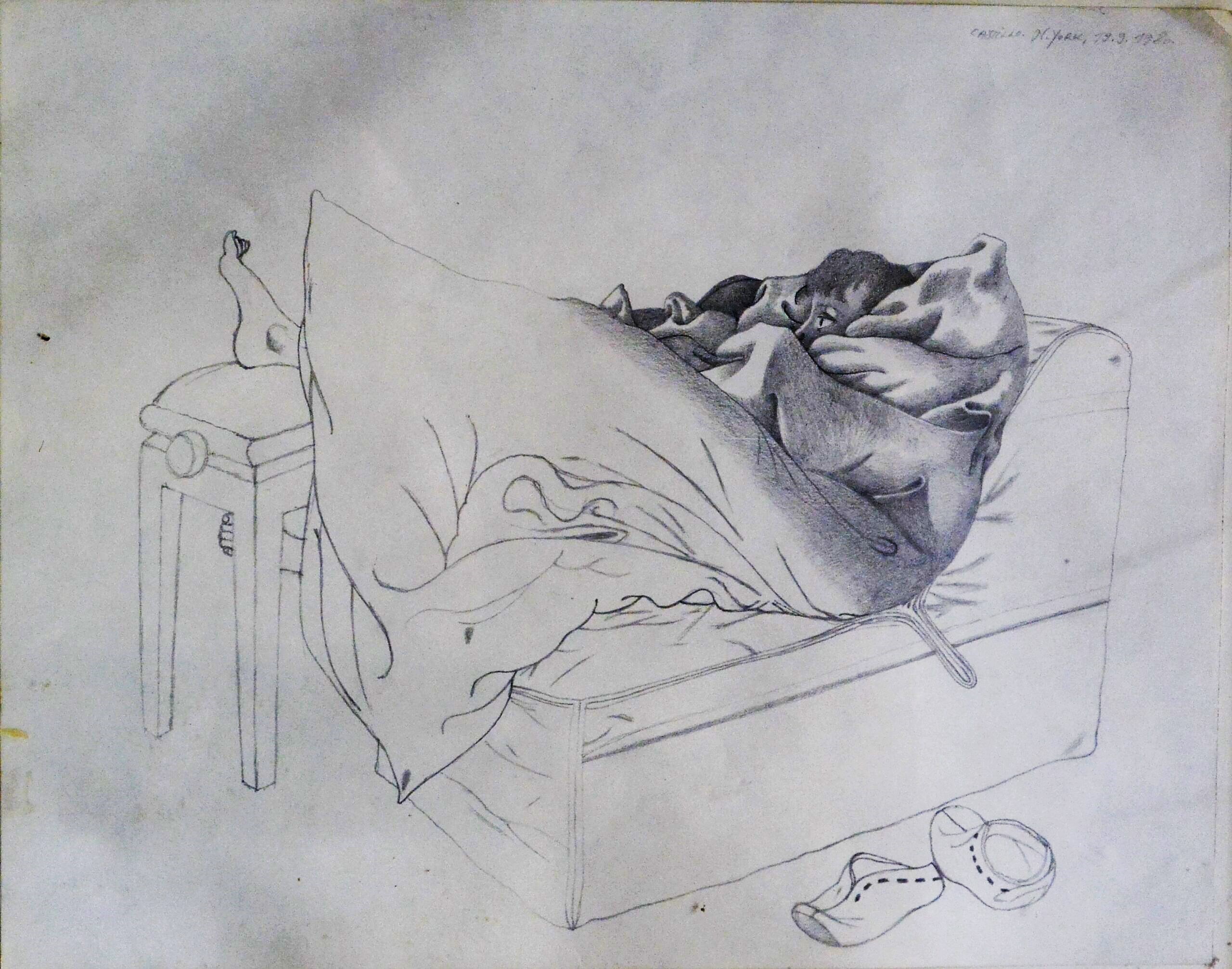 Jorge Castillo, Taggio reposando con los pies descalzos, dibujo lápiz papel, firmado en New York 1980, catalogado, enmarcado, papel 28×35 cms. y marco 47×54 cms. Marco incluido