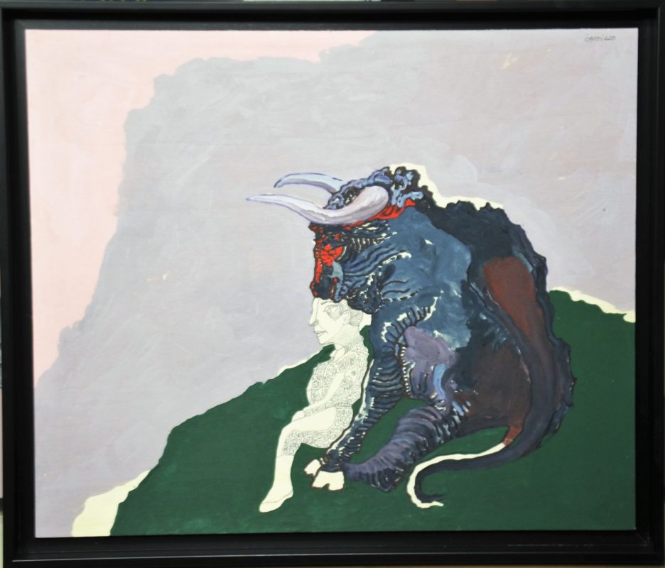 Jorge Castillo, Toro y torero amigos, pintura original acrílico sobre tabla, enmarcado, pintura 46×55 cms. y marco 51×60 cms.
