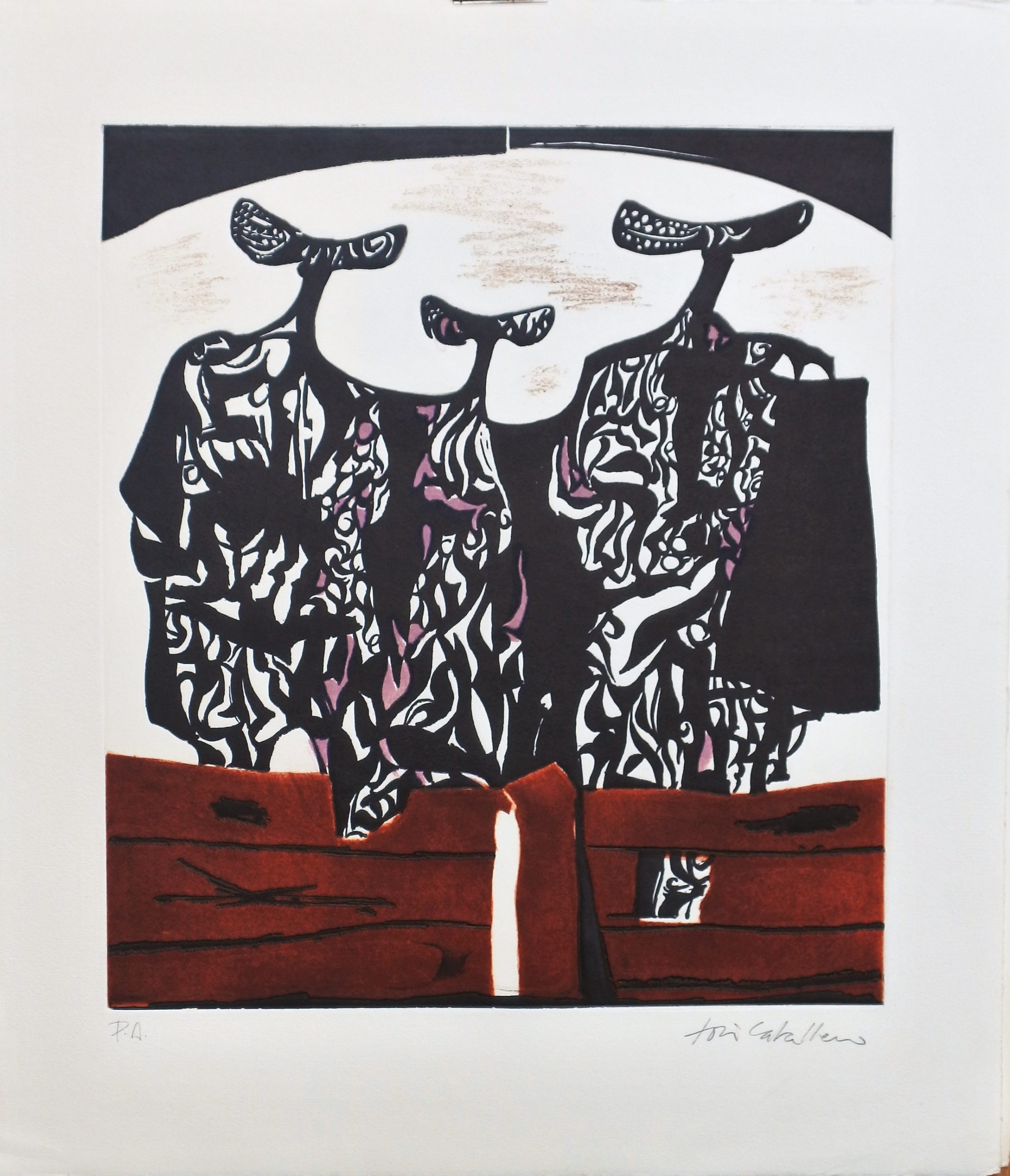 José Caballero, Tres toreros, grabado aguafuerte, edición 250 ejemplares, numerado p.a. y firmado a lápiz, plancha 34×31 cms. y papel 49×42 cms.