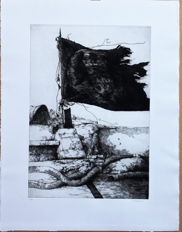 José Hernandez, Discurso cárdeno III, la bandera, grabado aguafuerte, edición 92 ejemplares, numerado y firmado a lápiz, plancha 49×34 cms. y papel 50×65 cms. Editado en 1992 con motivo del 500 aniversario del descubrimiento de América