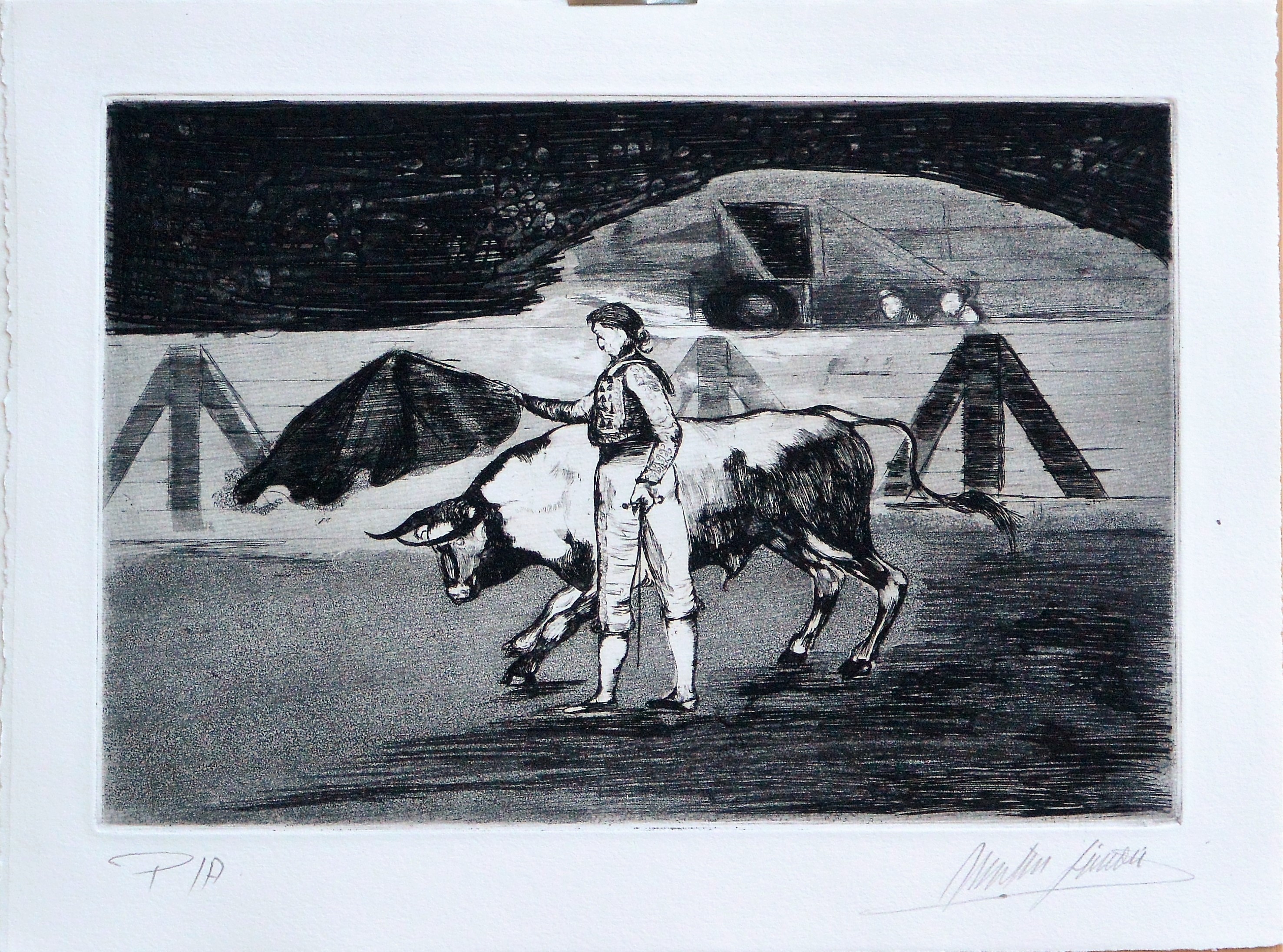 José Martín Simón, Tauromaquia, pase taurino, grabado aguarfuerte, edición xx ejemplares, numerado y firmado a lápiz, huella 21×31,50 cms. y papel 28,50×37,50 cms.