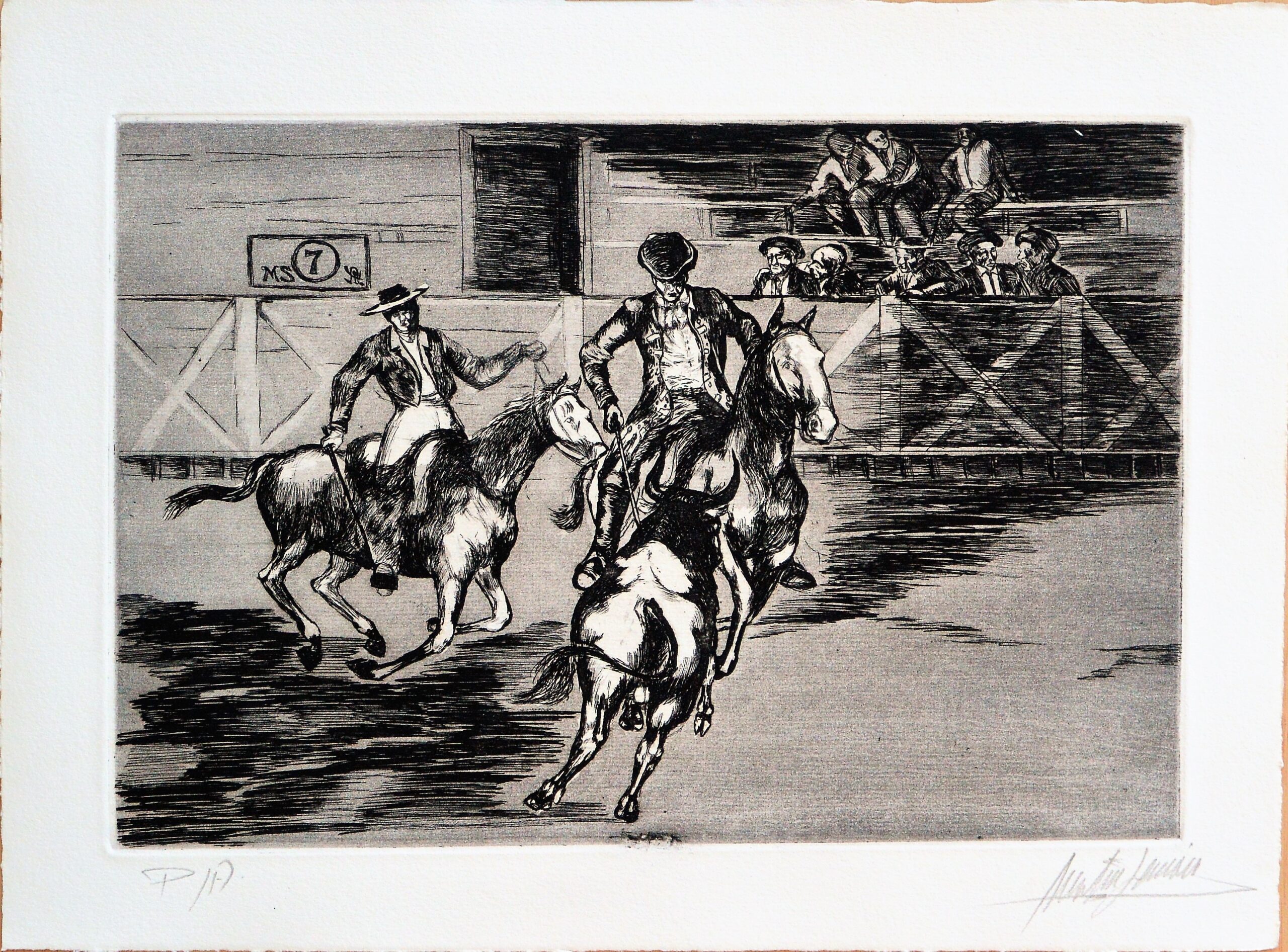 José Martín Simón, Tauromaquia, rejoneo, grabado aguarfuerte, edición xx ejemplares, numerado y firmado a lápiz, huella 21×31,50 cms. y papel 28,50×37,50 cms.