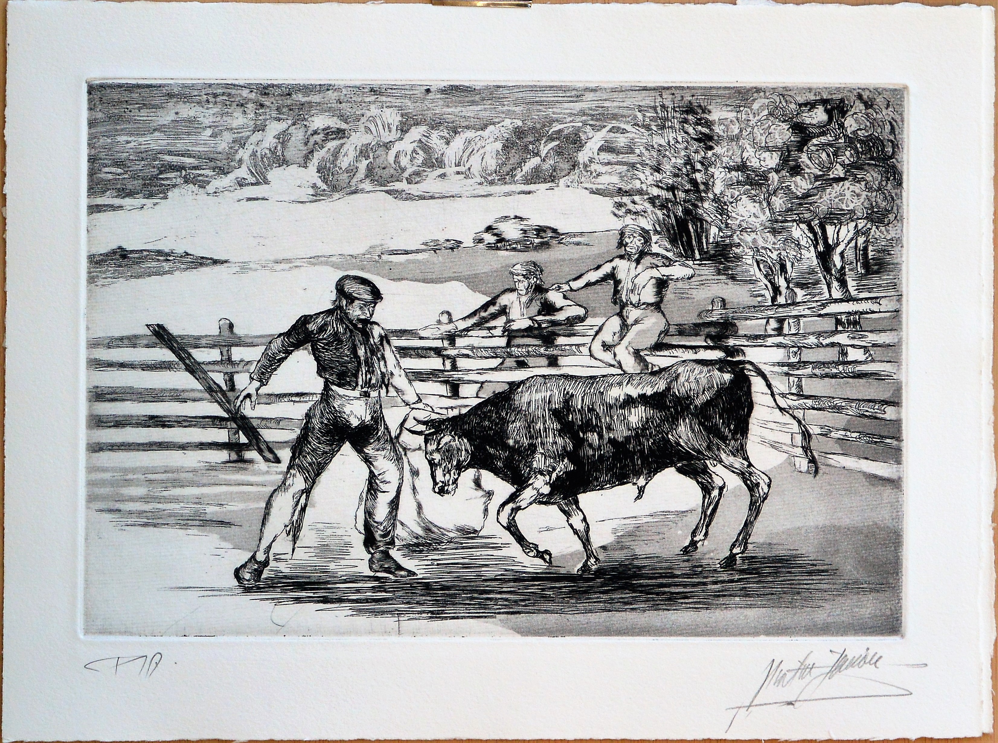 José Martín Simón, Tauromaquia, Tienta, grabado aguarfuerte, edición xx ejemplares, numerado y firmado a lápiz, huella 21×31,50 cms. y papel 28,50×37,50 cms.