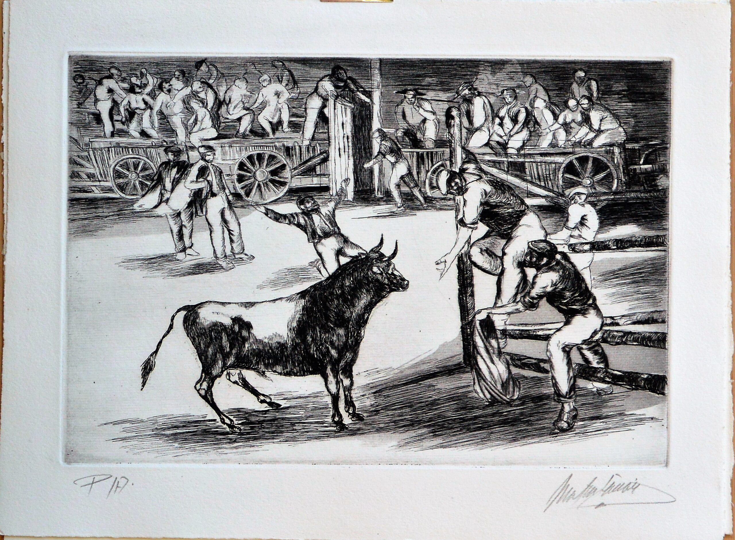 José Martín Simón, Tauromaquia, toros en la plaza del pueblo, grabado aguarfuerte, edición xx ejemplares, num y firmado a lápiz, huella 21×31,50 cms. y papel 28,50×37,50 cms.