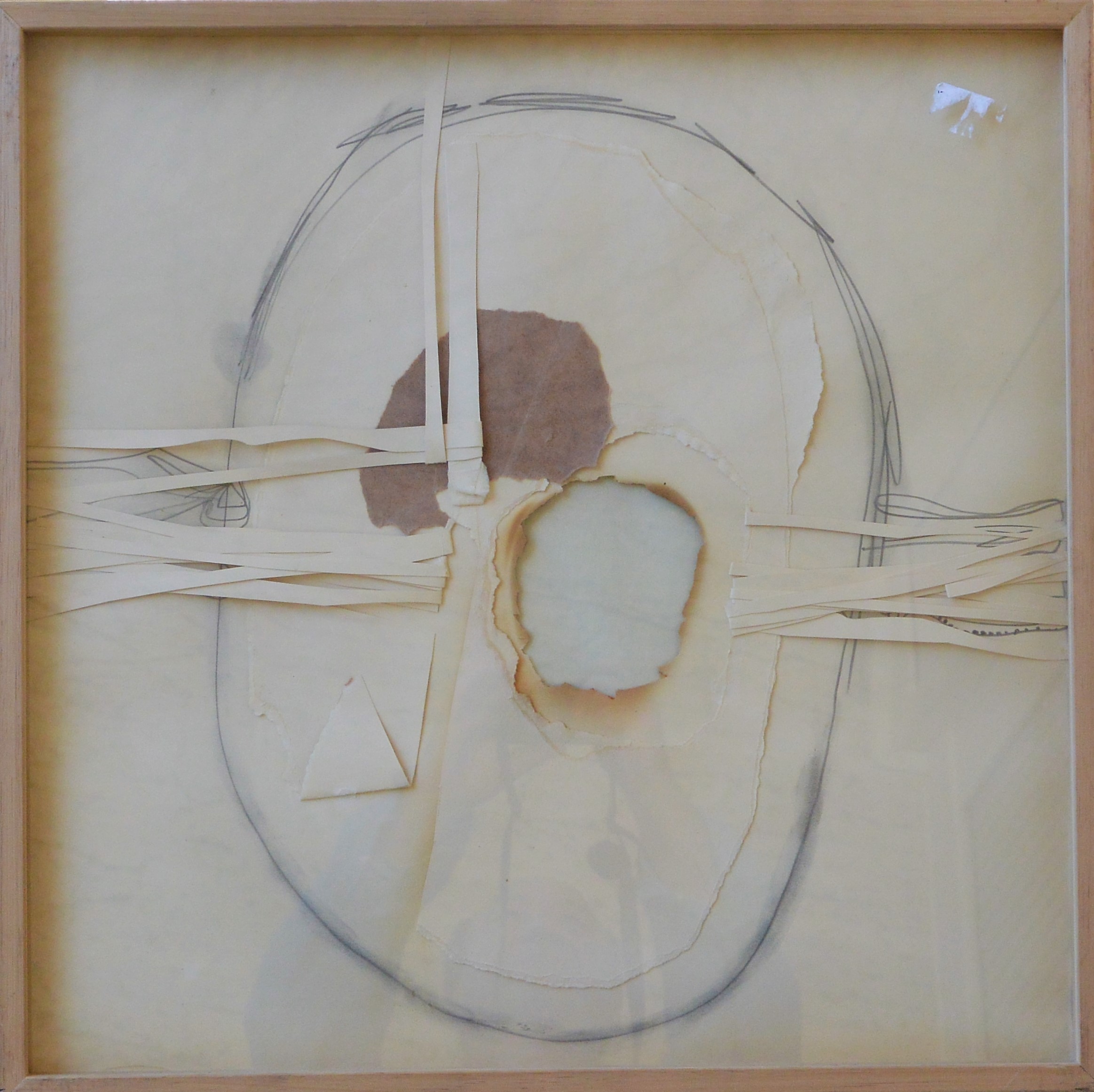 Josep Guinovart 1967, Composición, técnica mixta y collage, firmado al dorso, enmarcado, obra 50×50 cms, y marco 52×52 cms.