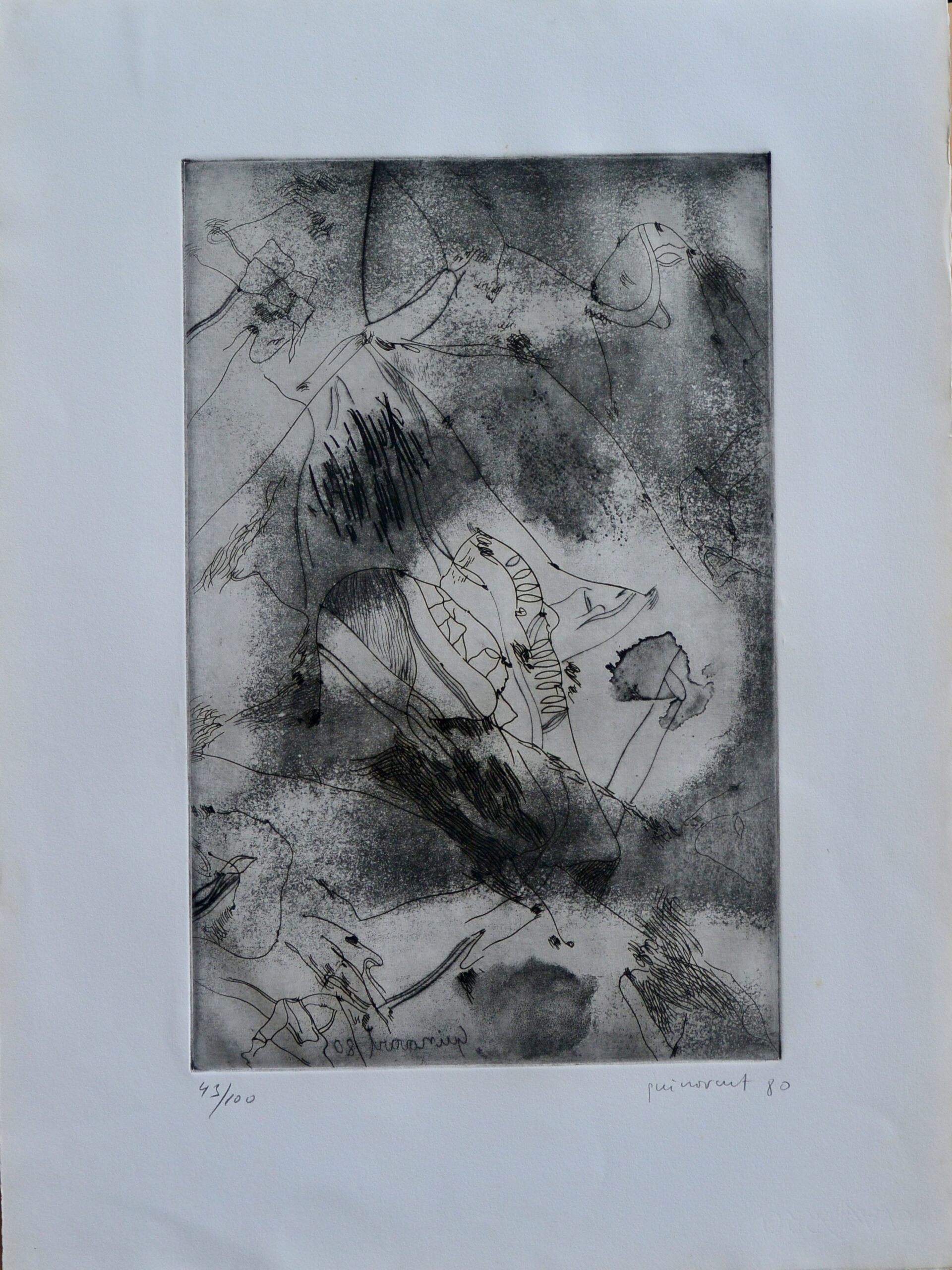 Josep Guinovart, Figuras, grabado, numerado 43/100 y firmado a lapiz en 1980, papel 70×52 cms. y plancha 49,50×32 cms.