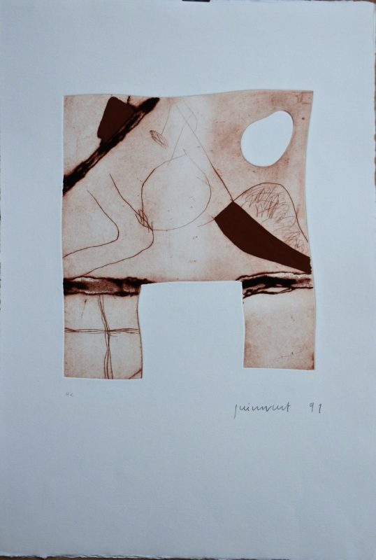 Josep Guinovart, Imatges y terra-6, grabado aguafuerte coloreado a mano, edición 50 ejemplares, numerado, datado 91 y firmado a lápiz, plancha 29×25 cms. y papel 57×39 cms.