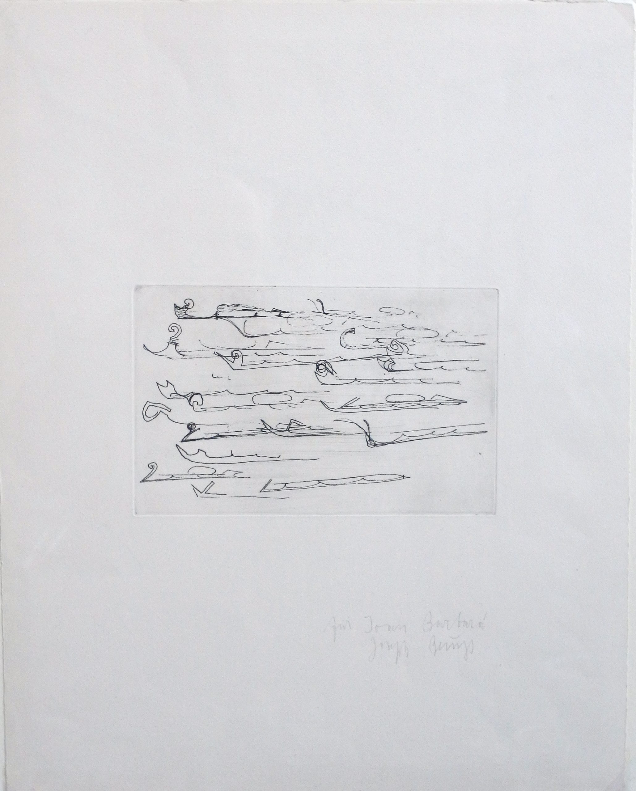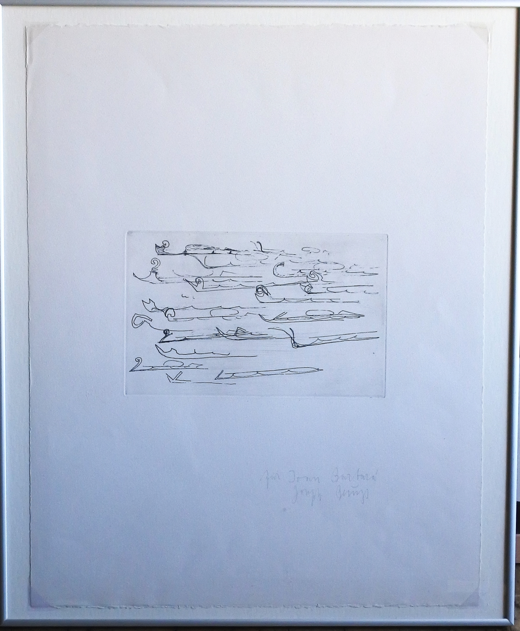Joseph Beuys, Zirkulationszeit `Urschlitten I, grabado, con dedicatoria al editor Joan Barberá, enmarcado, plancha 16×25 cms. papel 56×45 cms. y marco 65×54 cms.