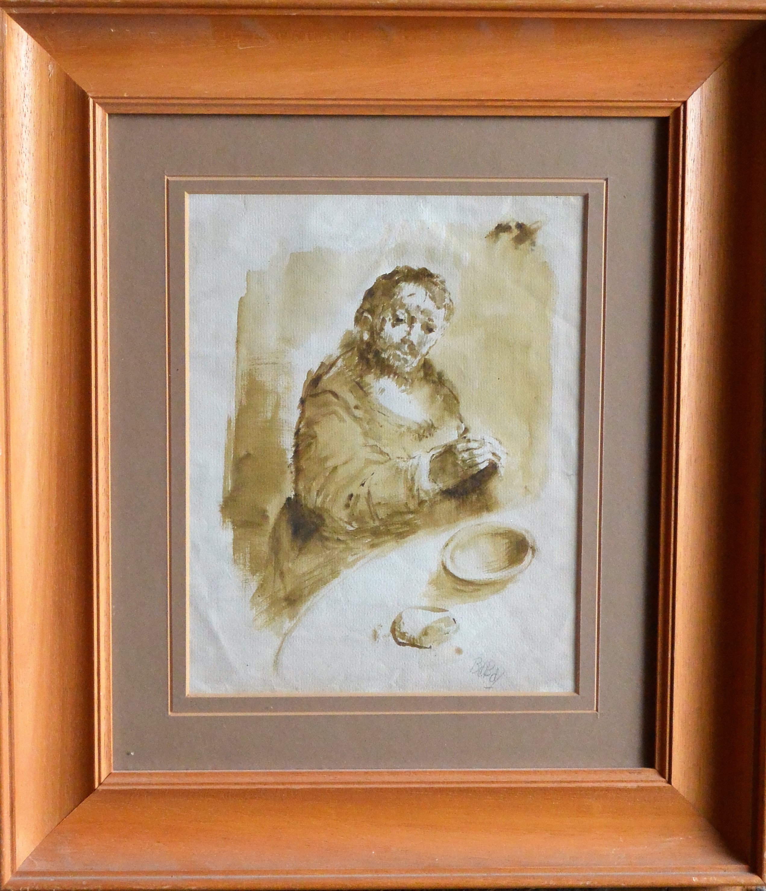 Juan Barba, Monje en el refectorio, dibujo aguada papel, enmarcado, dibujo 28×22 cms. y marco 49×43 cms.