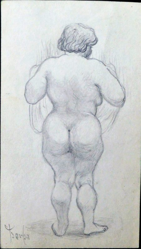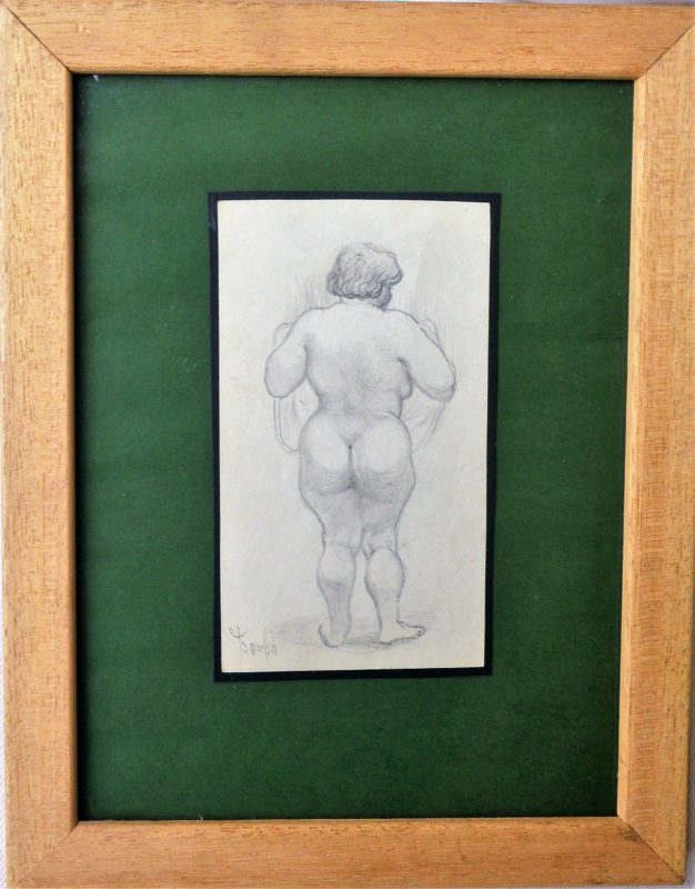 Juan Barba, Mujer ancha desnuda de espaldas, dibujo lápiz papel, enmarcado, dibujo 13,50×8 cms. y marco 25×20 cms.