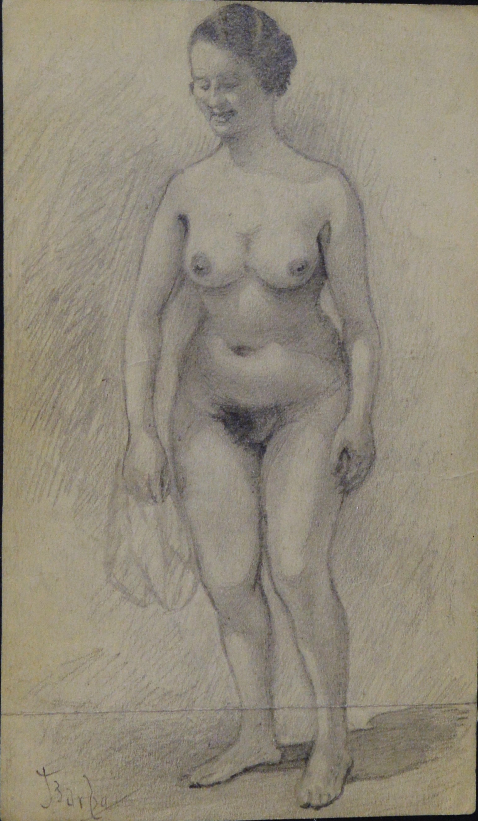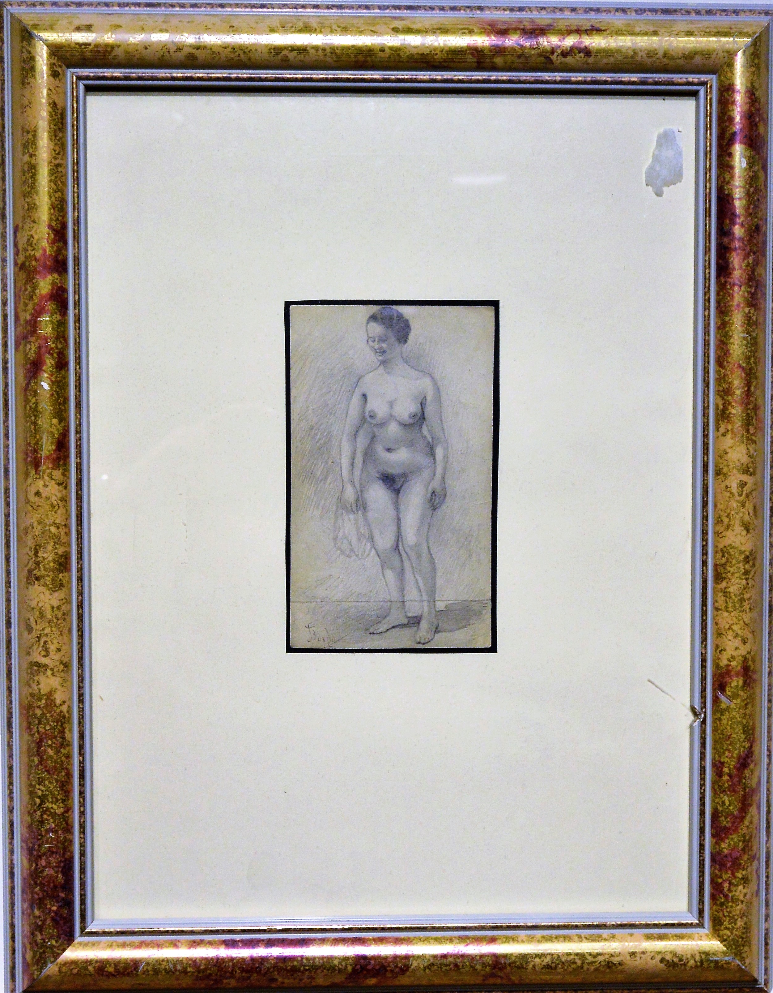 Juan Barba, Mujer desnuda con paño, dibujo lápiz papel, enmarcado, dibujo 16,50×10 cms. y marco 47,50×37,50 cms.