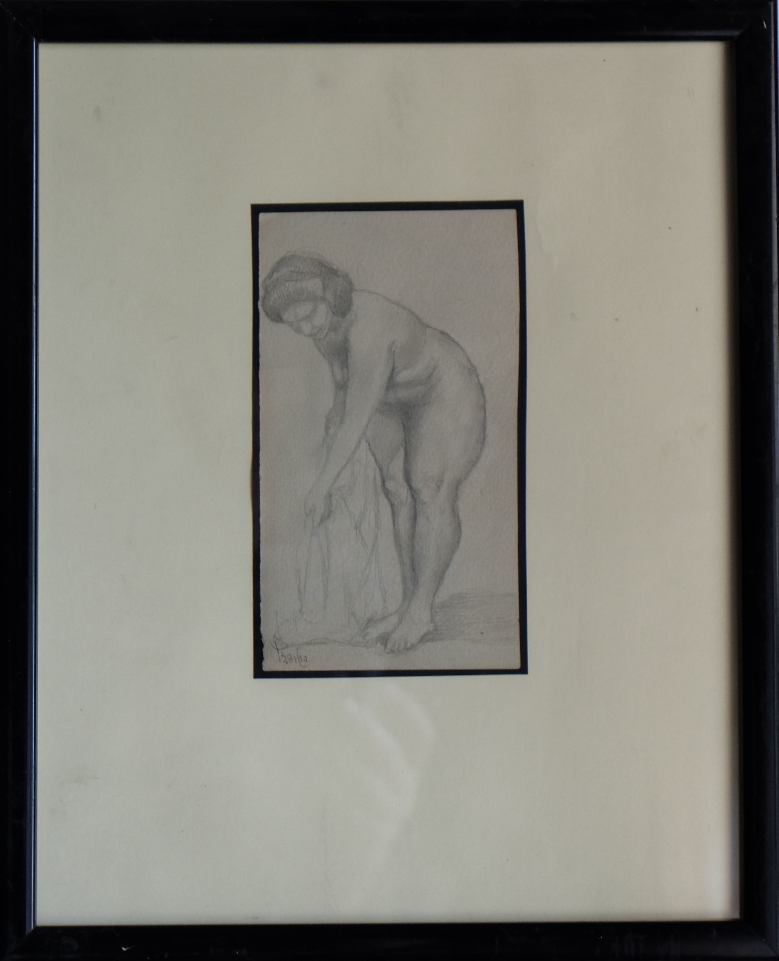Juan Barba, Mujer desnuda recogiendo sábana, dibujo lápiz papel, enmarcado, papel 15×8,50 y marco 32×26 cms.