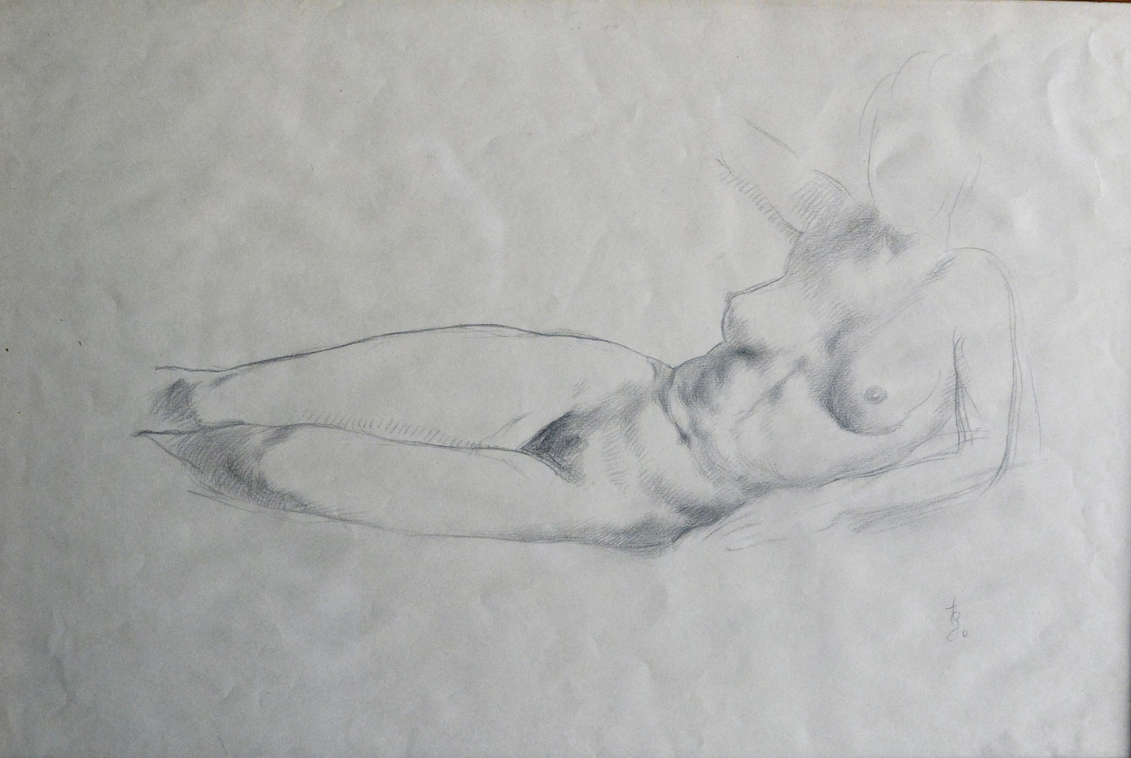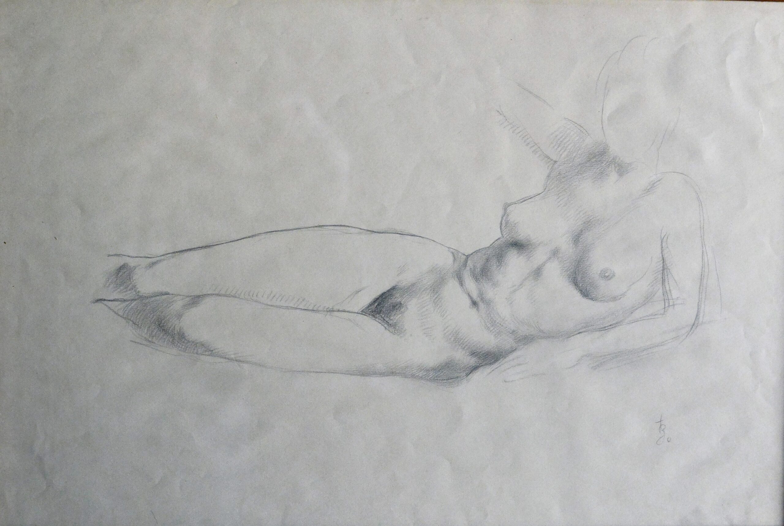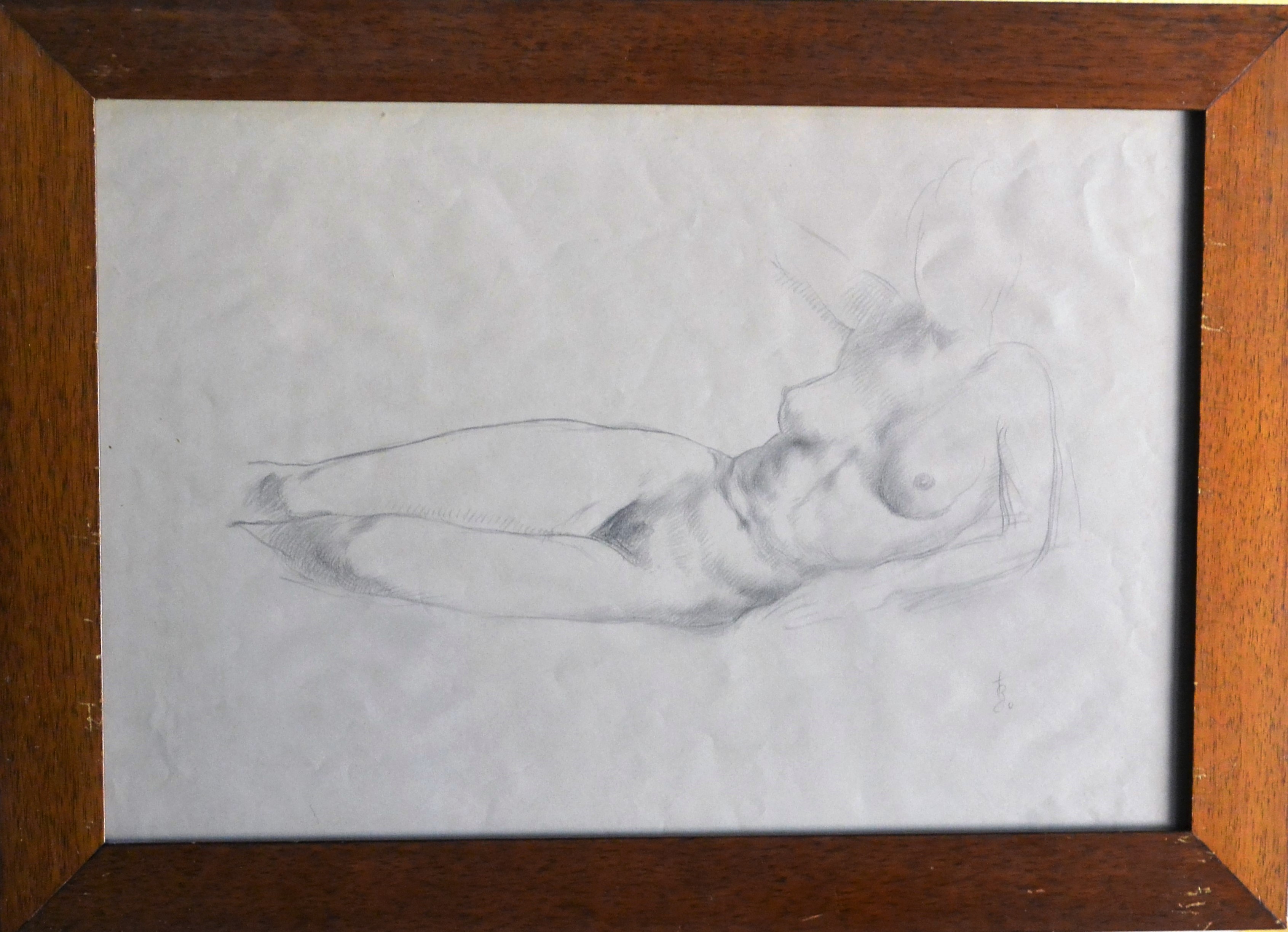 Juan Barba, Mujer desnuda tumbada, dibujo lápiz papel, enmarcado, dibujo 28×42 cms. y marco 35×49 cms.