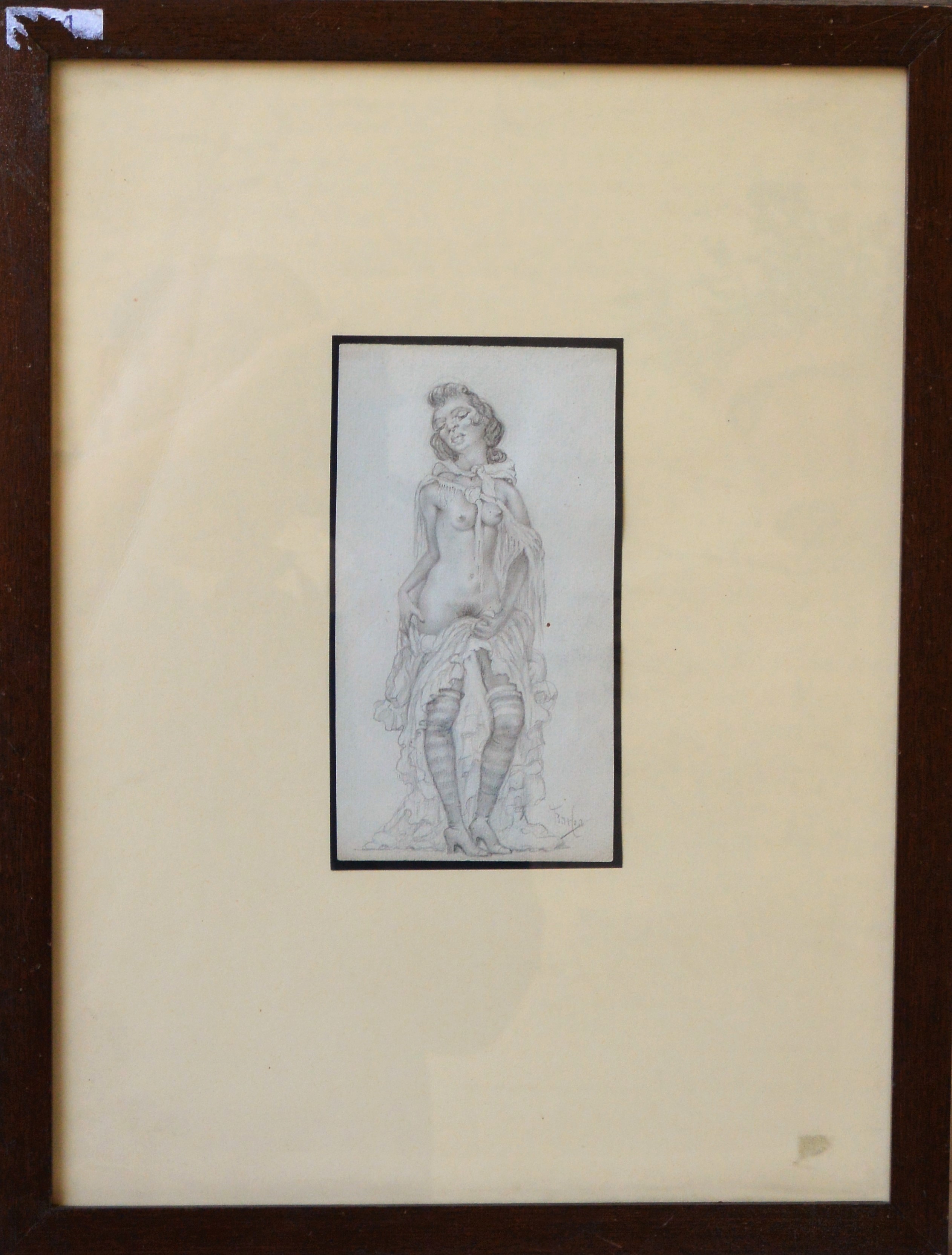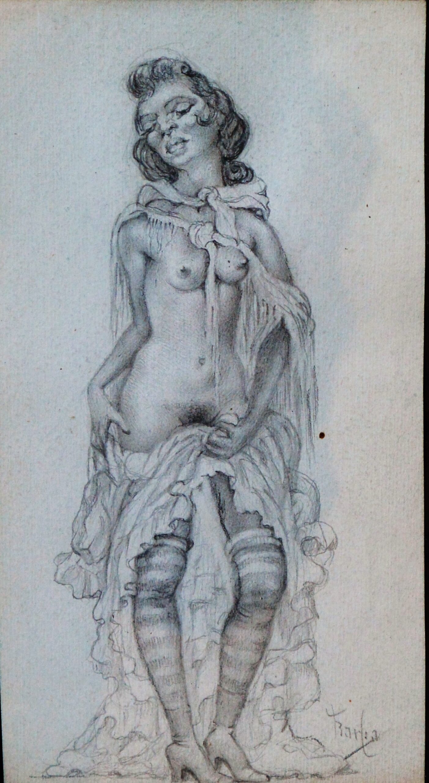 Juan Barba, Mujer flaca desnuda con medias a rayas, dibujo lápiz papel, enmarcado dibujo 17×9 cms. y marco 41×31,50 cms. Marco incluido