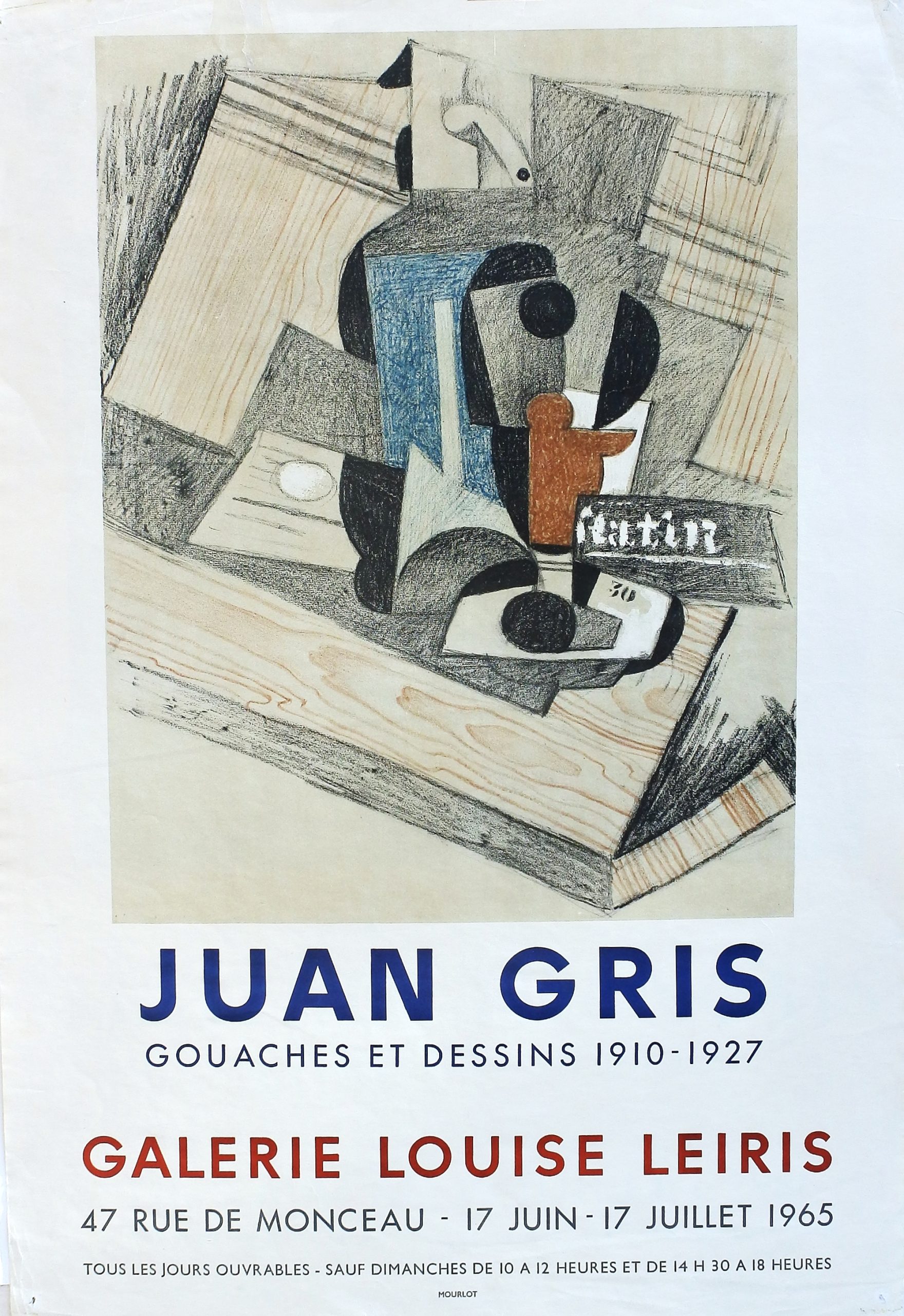 Juan Gris, Gouaches et dessins, cartel original exposición en Galerie Louise Leiris Paris en 1965, 67×50 cms. Impreso por Mourlot