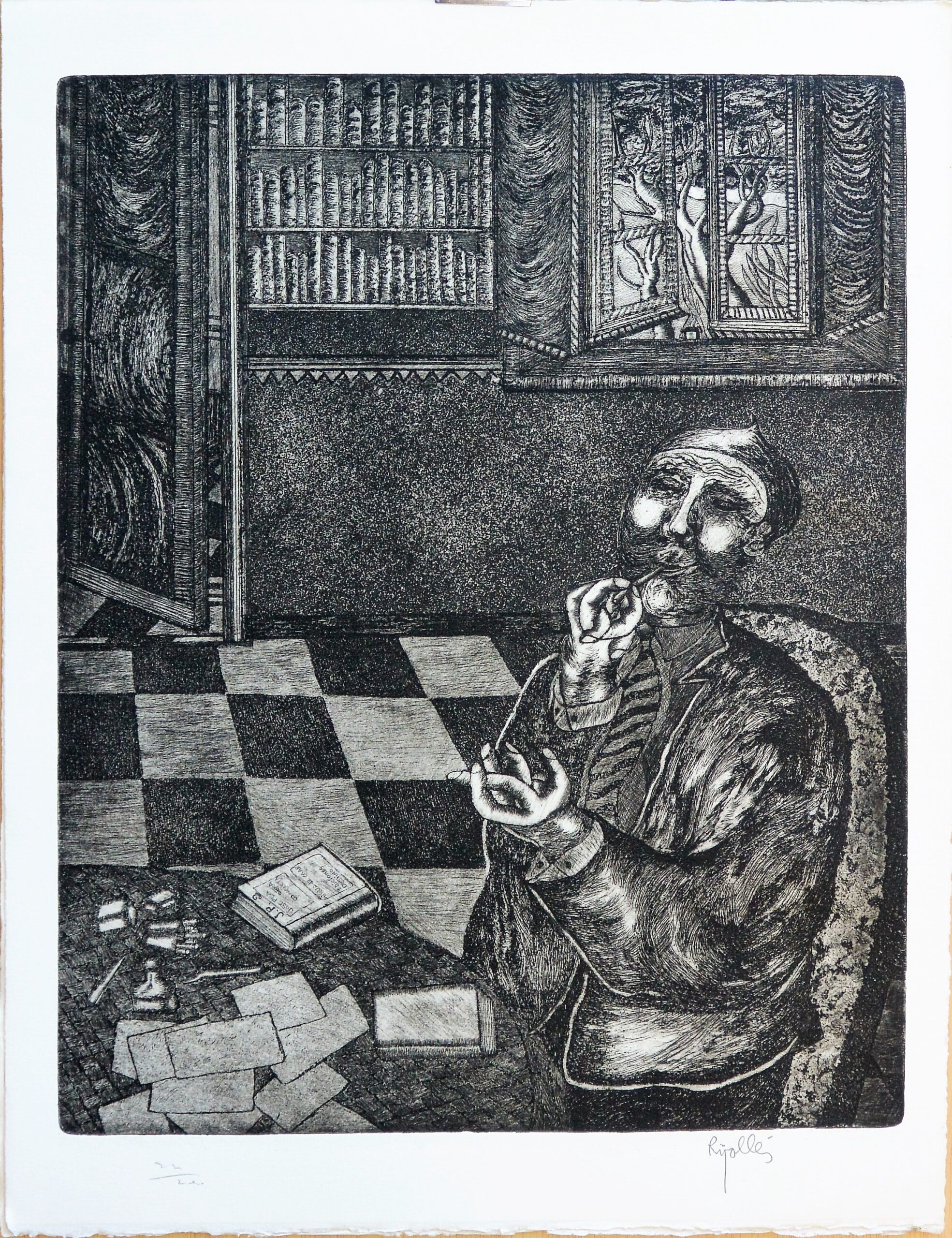 Juan Ripollés, Fumador, grabado aguafuerte, ed. 200 ej., num y firmado a lápiz, plancha 42×34 cms. y papel 49×38 cms. ilustración para el libro Un viatge frustrat de Josep Pla