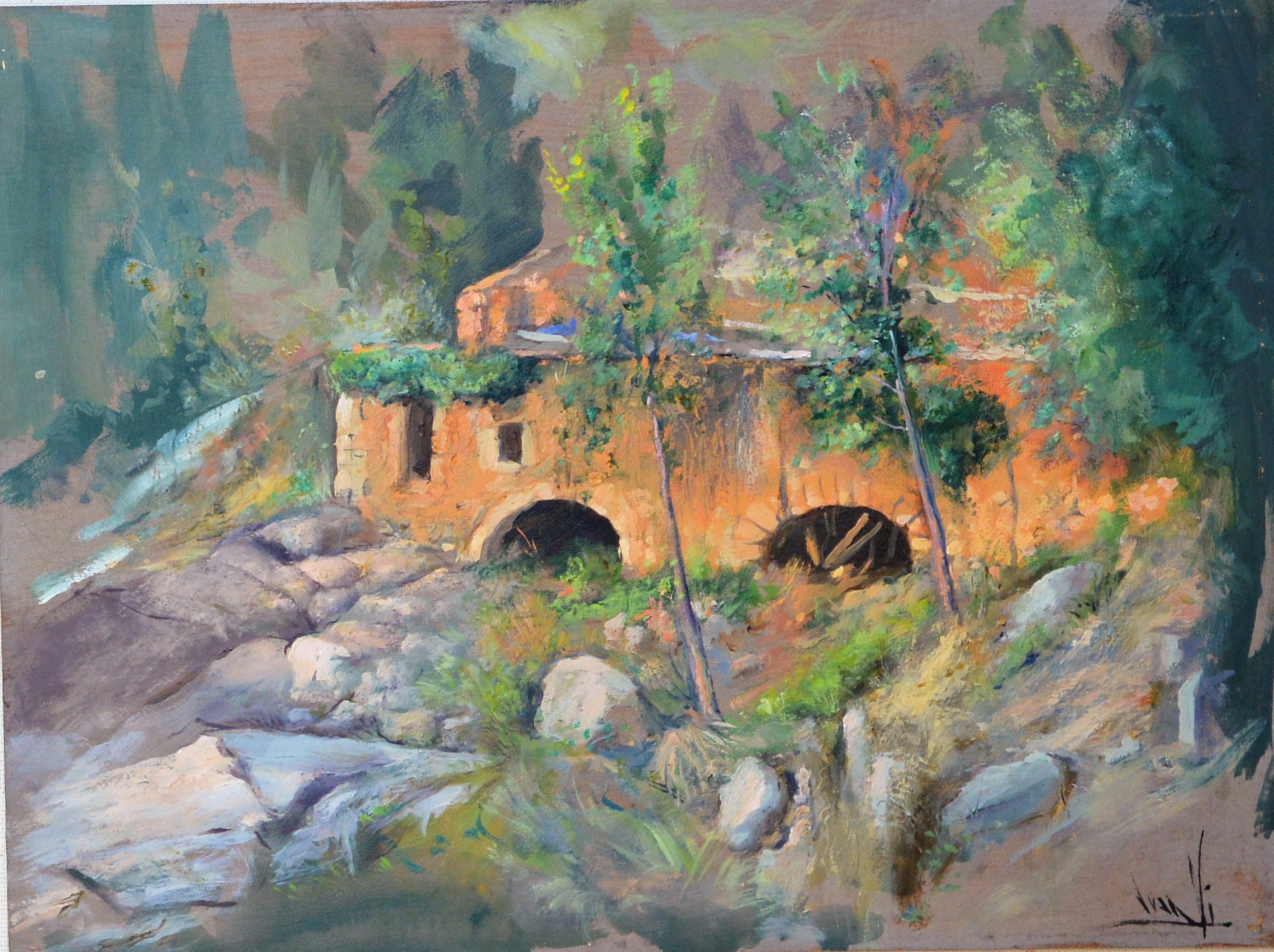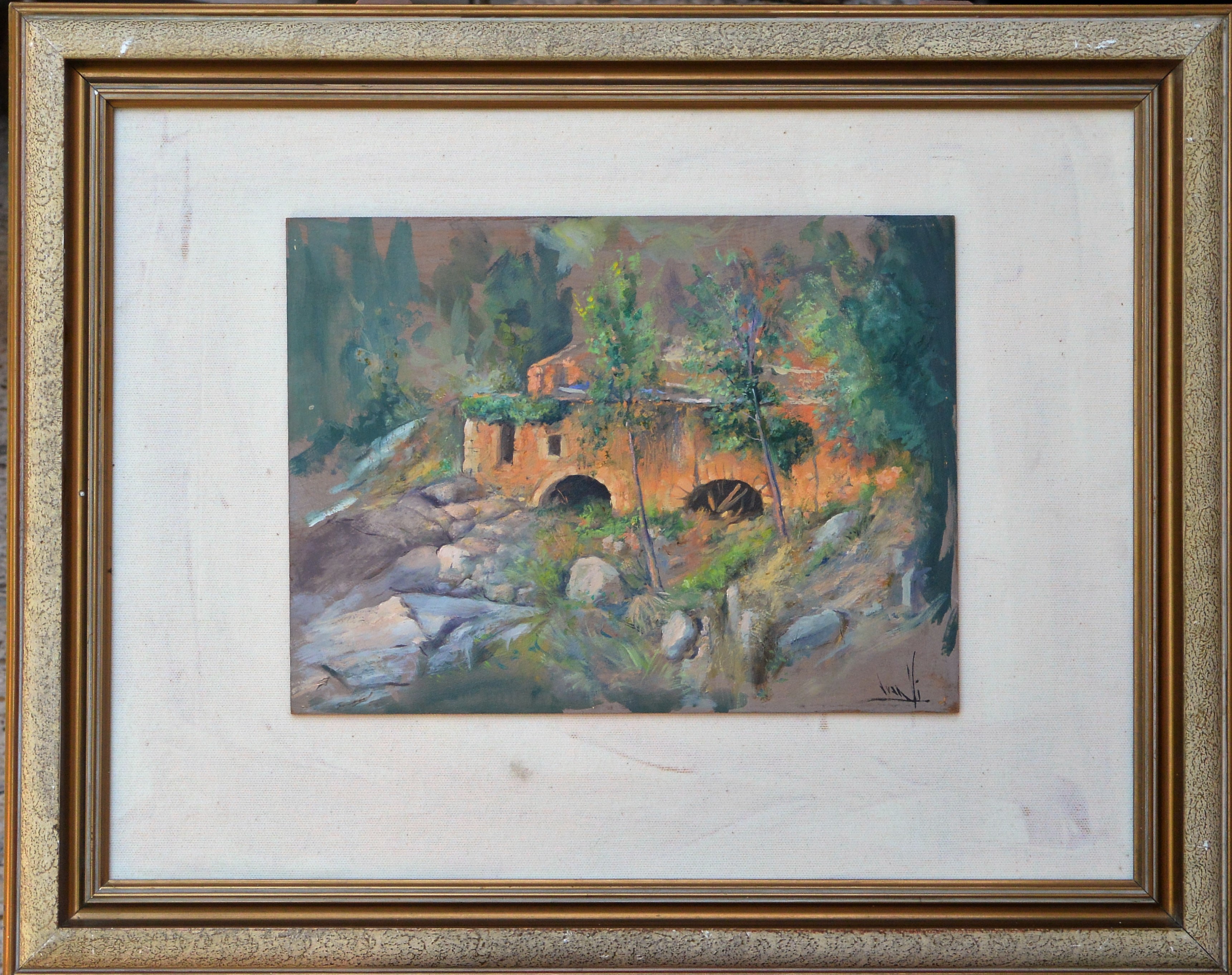 Juan Vicente Barrio Juanvi, Paisaje con molino de agua, pintura oleo tablex, enmarcado, pintura 26×35 cms. y marco 51×64 cms.