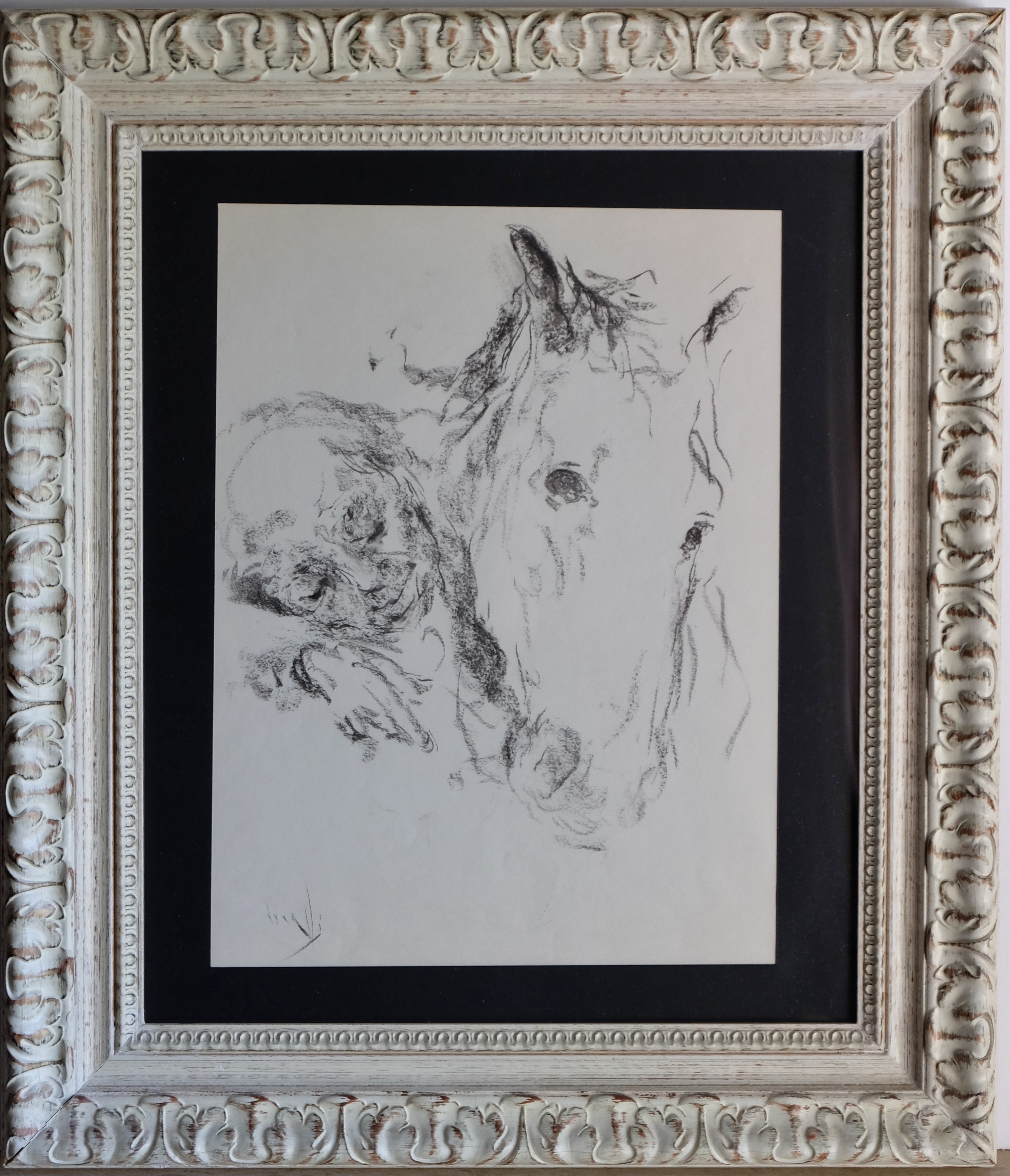Juan Vicente Barrio, Juanvi, Viejo y cabeza de caballo, dibujo carboncillo, enmarcado, dibujo 40×29 y marco 59×50 cms.