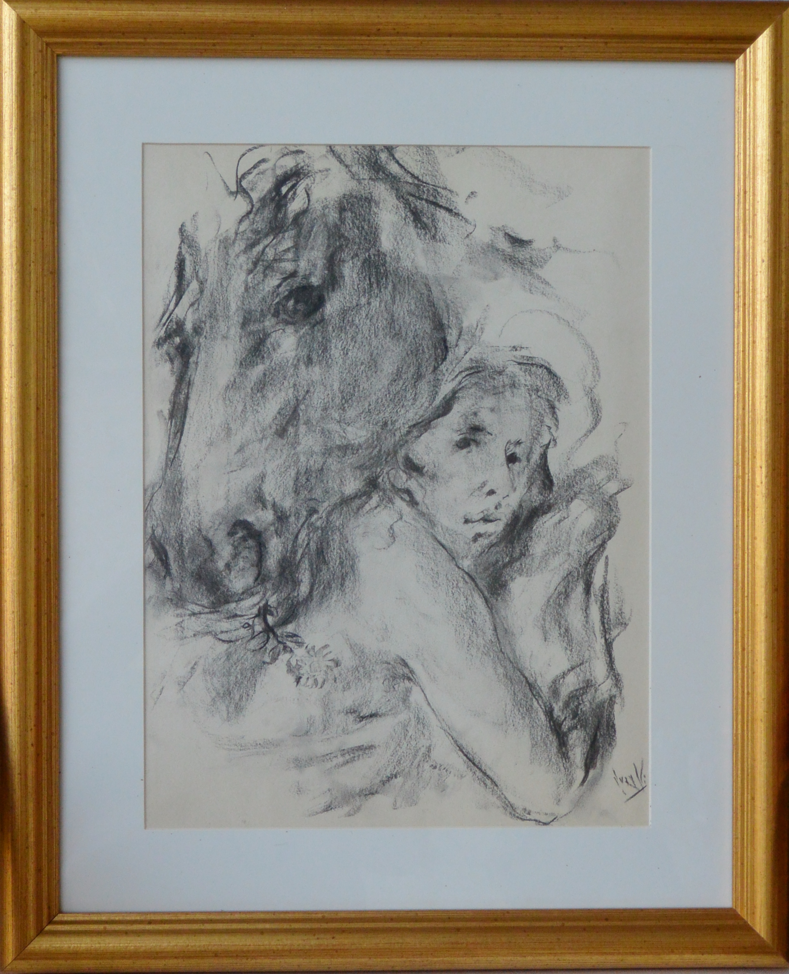 Juanvi, Juan Vicente Barrio, Mujer joven y caballo, dibujo carboncillo papel, enmarcado, dibujo 52×42 cms. y marco 40×30 cms. Marco incluido.