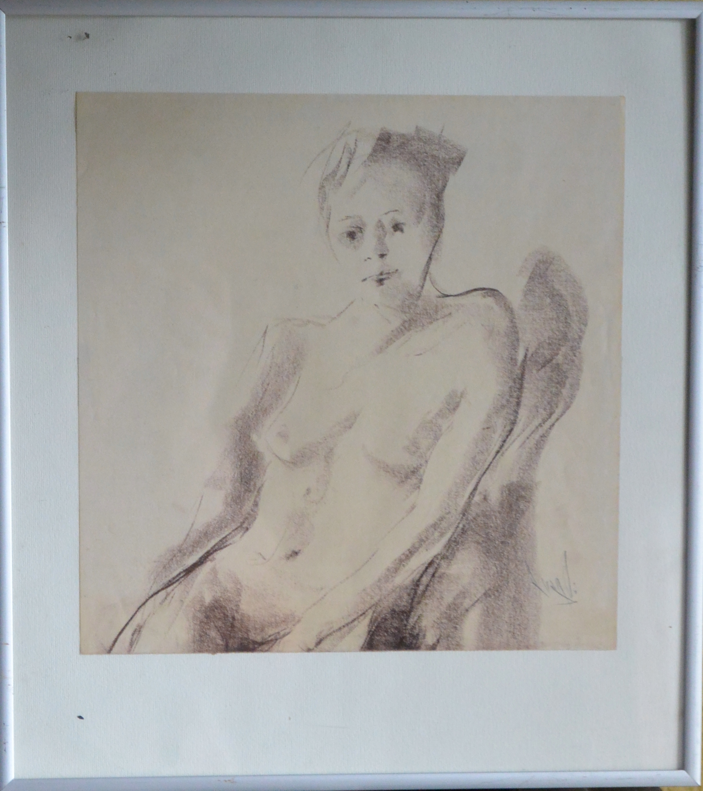 Juanvi, Juan Vicente Barrio, Torso joven desnuda sentada, dibujo carboncillo papel, enmarcado, dibujo 22×21,50 cms. y marco 31×28,50 cms. Marco incluido.