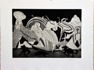 Julio Zachrisson, Pan-Amá V, territorio hostil, grabado aguafuerte, edición 92 ejemplares, numerado y firmado a lápiz, plancha 34,50×49 cms. y papel 50×65 cms. editado con motivo del V centenario del descubrimiento de América