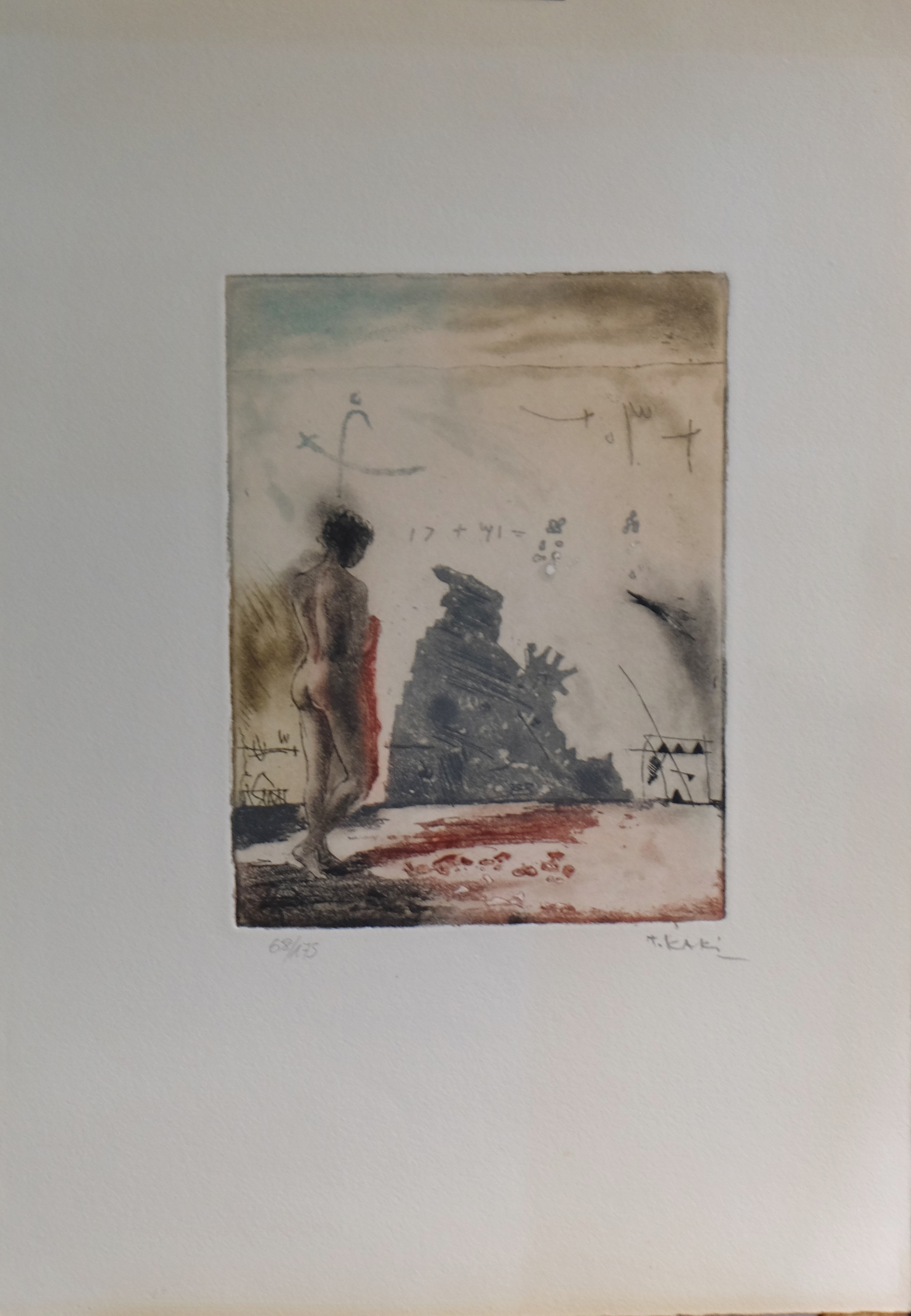 Kaki Jafar T. Mujer de pie ante pared, grabado edición 175 ejemplares, numerado y firmado a lápiz, plancha 19×15 y papel 39×28 cms.