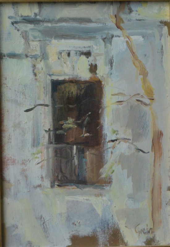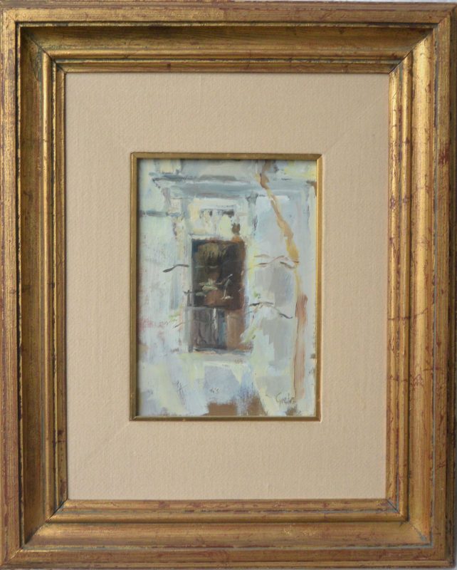 Lolon Malcroma Grete, El balcón, pintura oleo tablex, enmarcado, pintura 24×17 cms. y marco 51,50×42 cms.