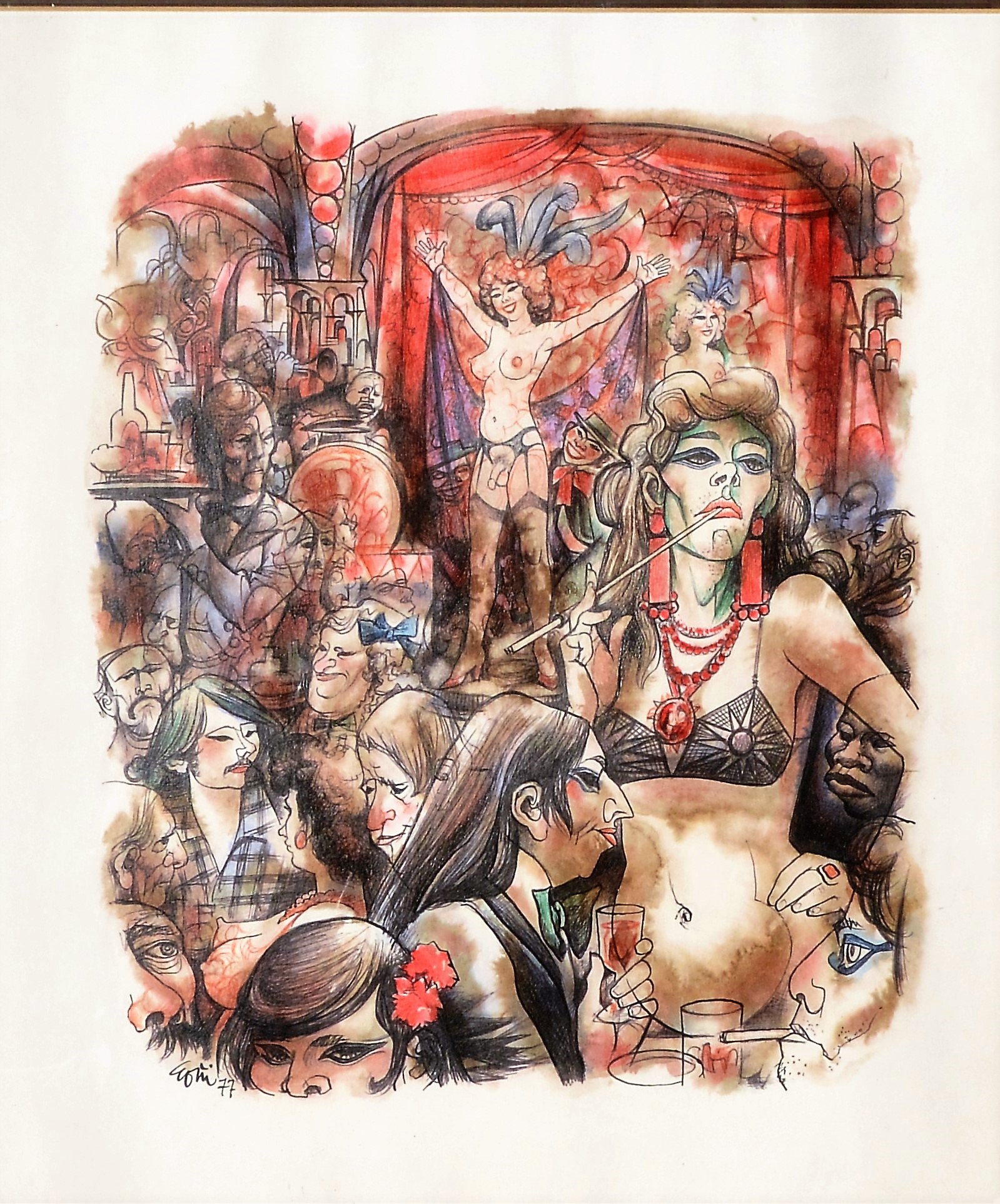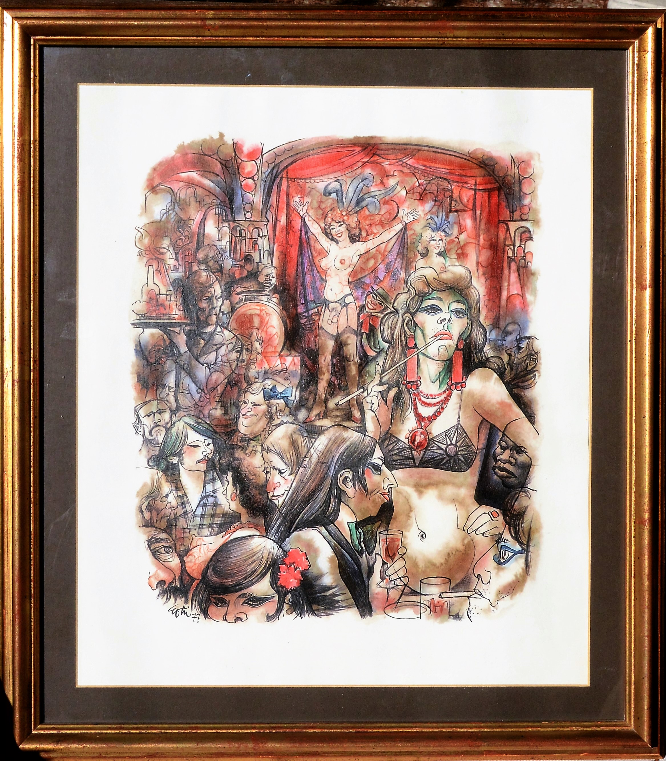 Lorenzo Goñi, Escena del cabaret, dibujo tinta y acuarela papel, enmarcado, dibujo 37×32 cms. y marco 47×41 cms.
