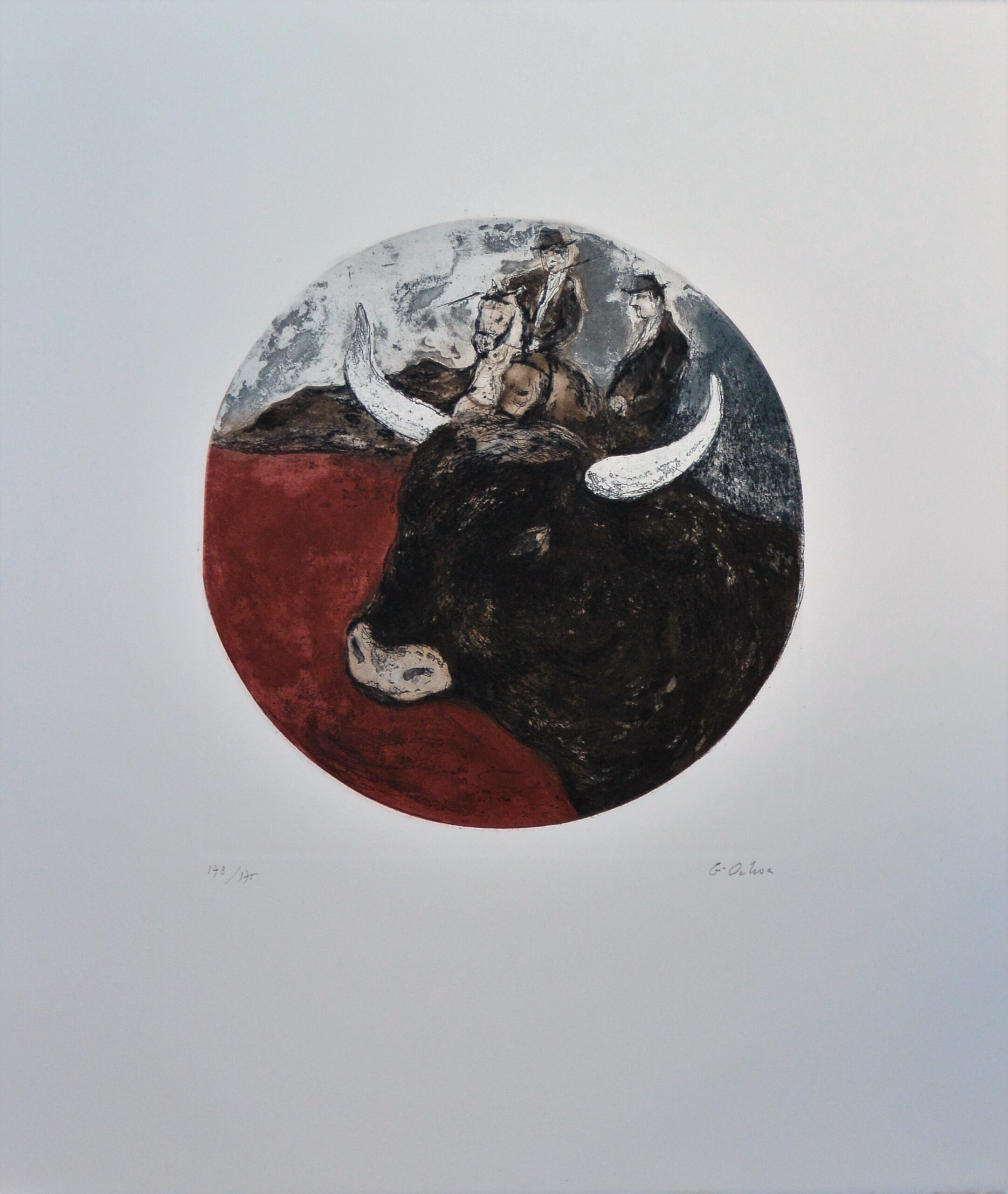 Luis García Ochoa, Grana y Oro, El Toro, grabado aguafuerte color, edición 175 ejemplares, numerado y firmado a lápiz, plancha 29×29 cms. (circular) y papel 60×50 cms.