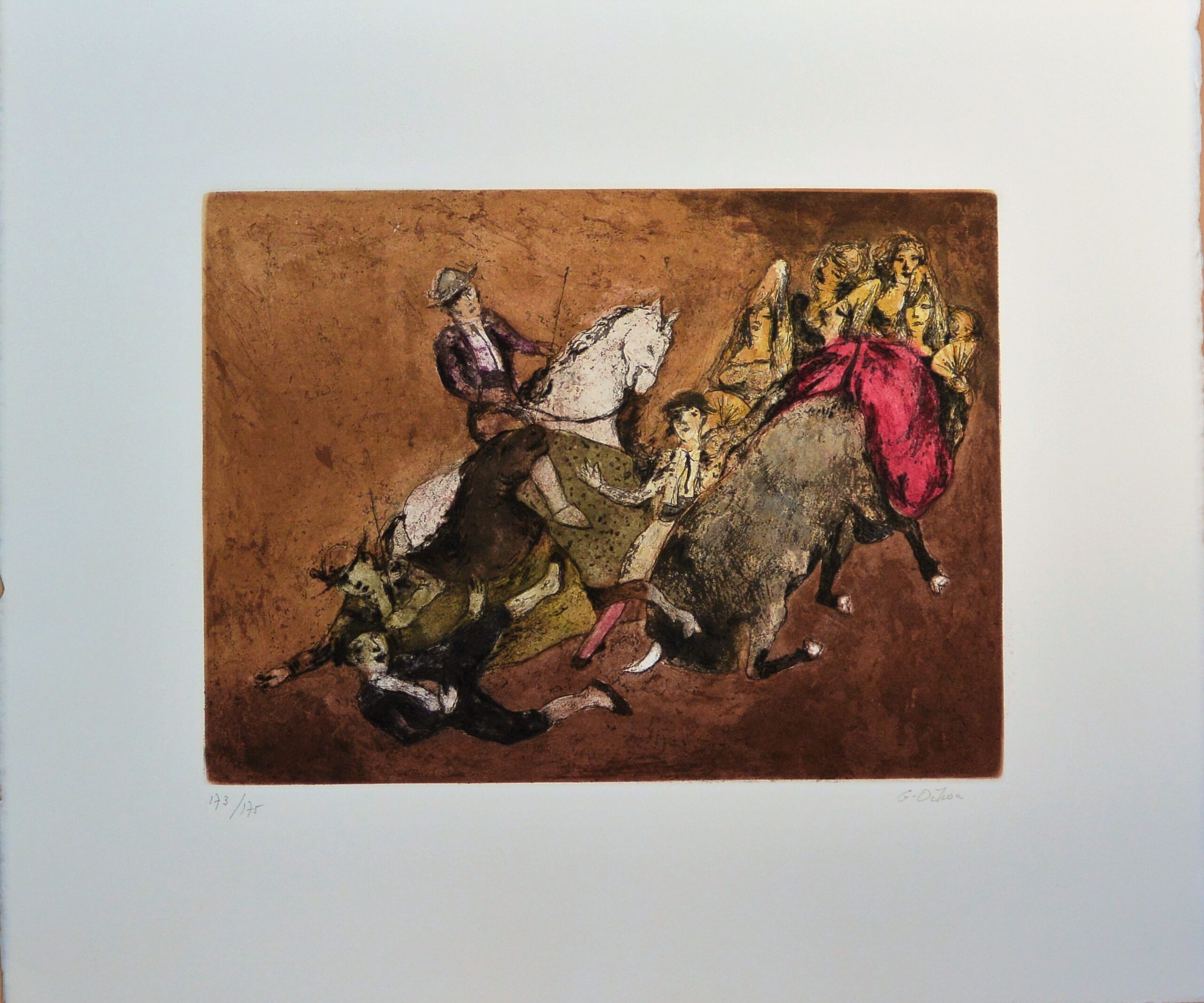 Luis García Ochoa, Grana y Oro, embestida, grabado aguafuerte color, edición 175 ejemplares, numerado y firmado a lápiz, plancha 29×39 cms. y papel 50×60 cms.