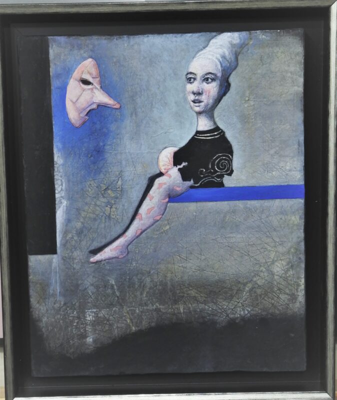 Luis V. Ortés, La loca de Kérkyra y el oráculo, pintura técnica mixta y collage sobre madera, enmarcado, pintura 27×22 cms. y marco 31,50×26 cms.