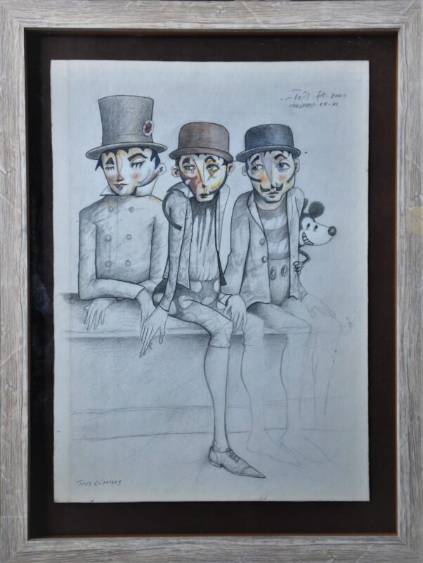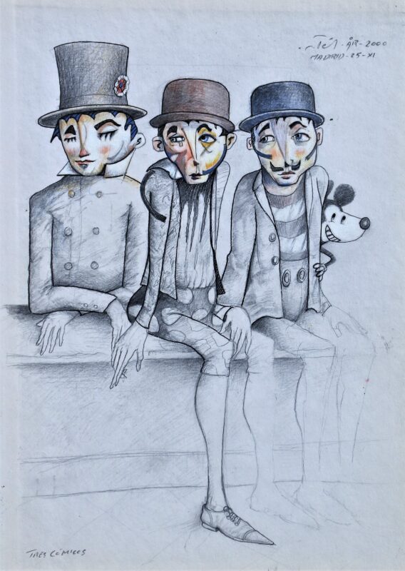 Luis V. Ortés,Tres cómicos, dibujo grafito y técnica mixta cartulina, enmarcado, dibujo 30×21,50 cms. y marco 37,50×28 cms.