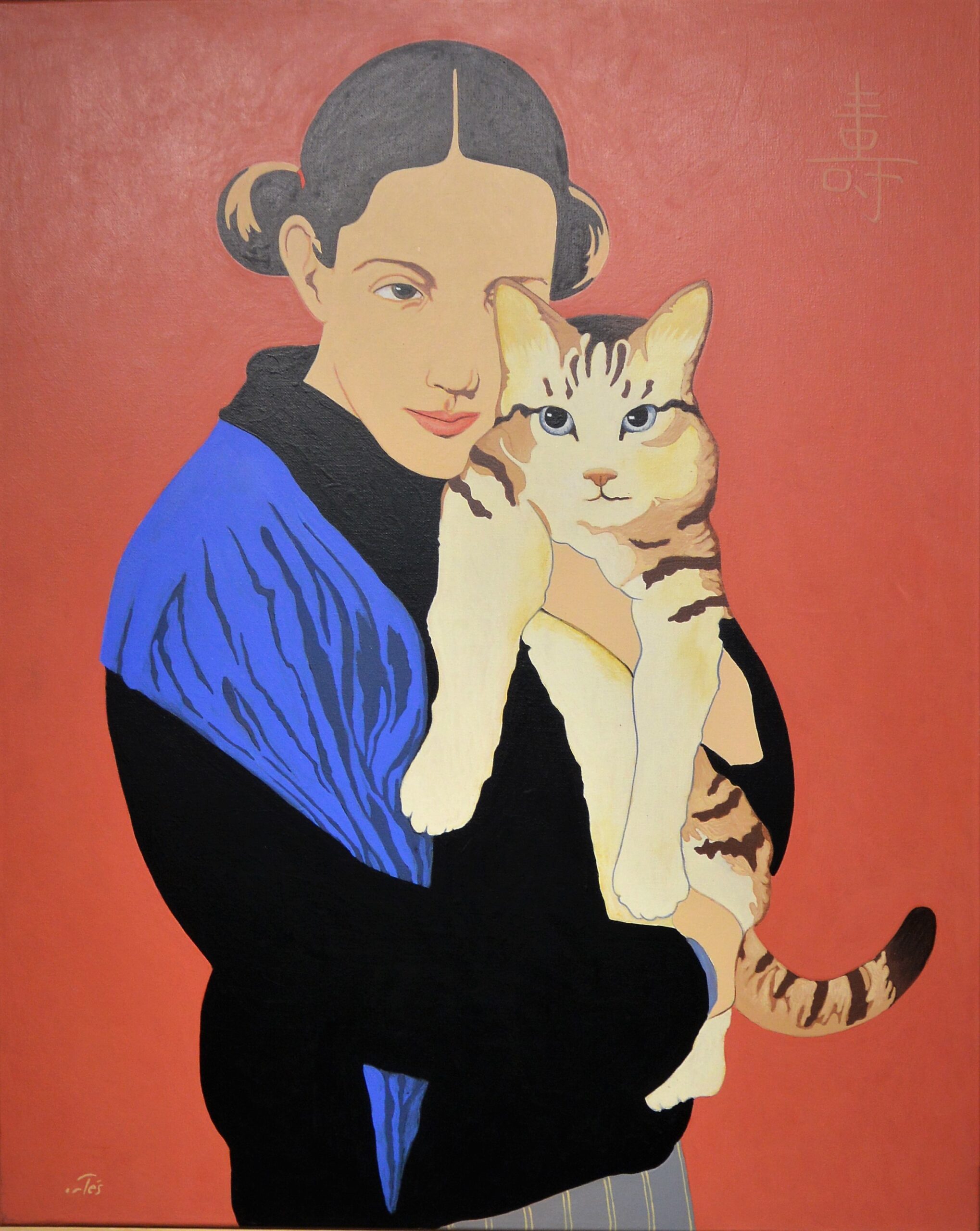 Luis Valcarcel Ortés, Chica con su gato, pintura acrílico lienzo, 81×65 cms.