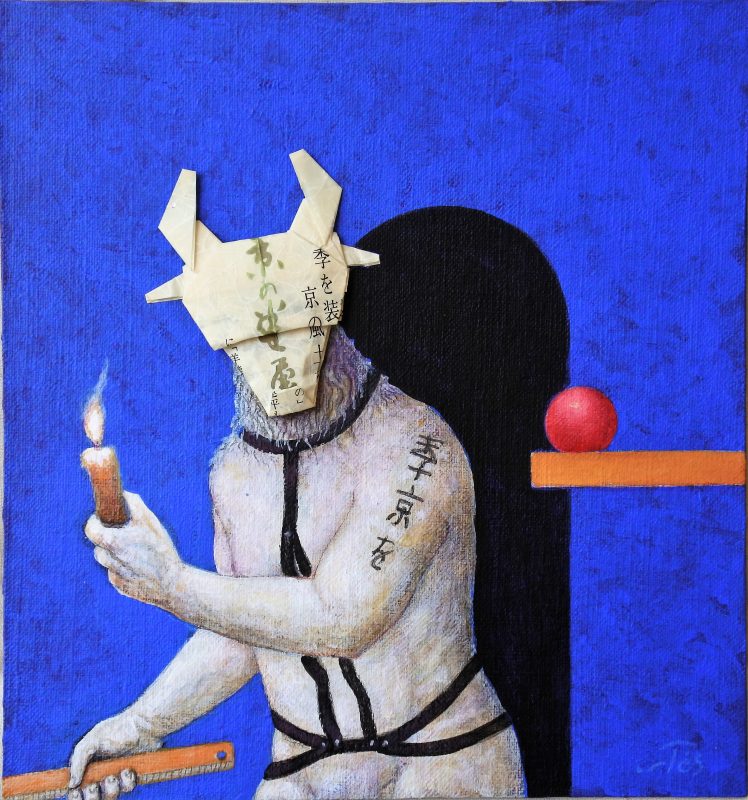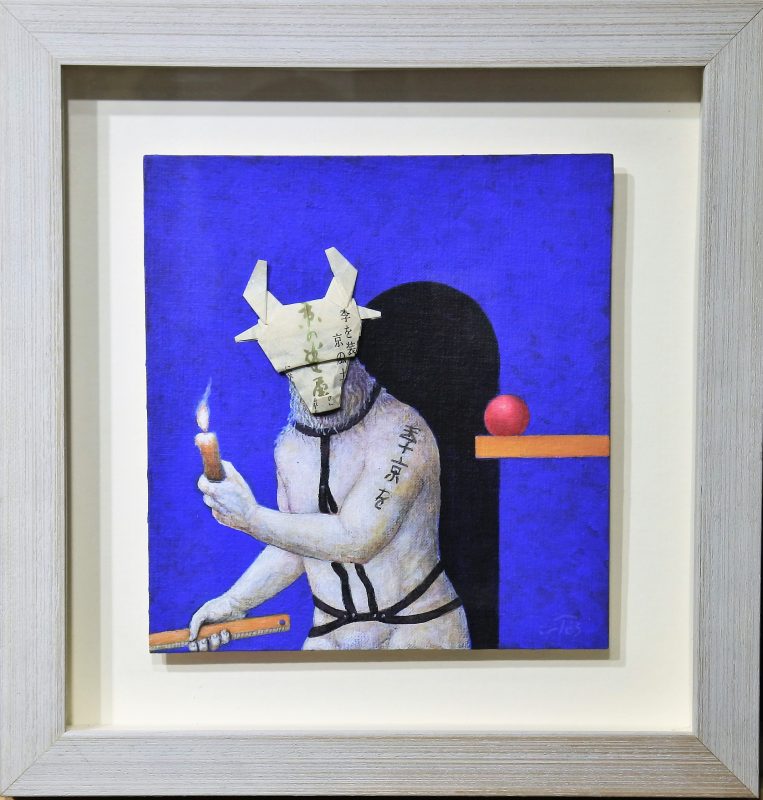 Luis V. Ortés, El Minotauro de Miyako, técnica mixta y origami sobre lienzo, enmarcado, pintura 23×21,50 cms. y marco 36×34,50 cms.