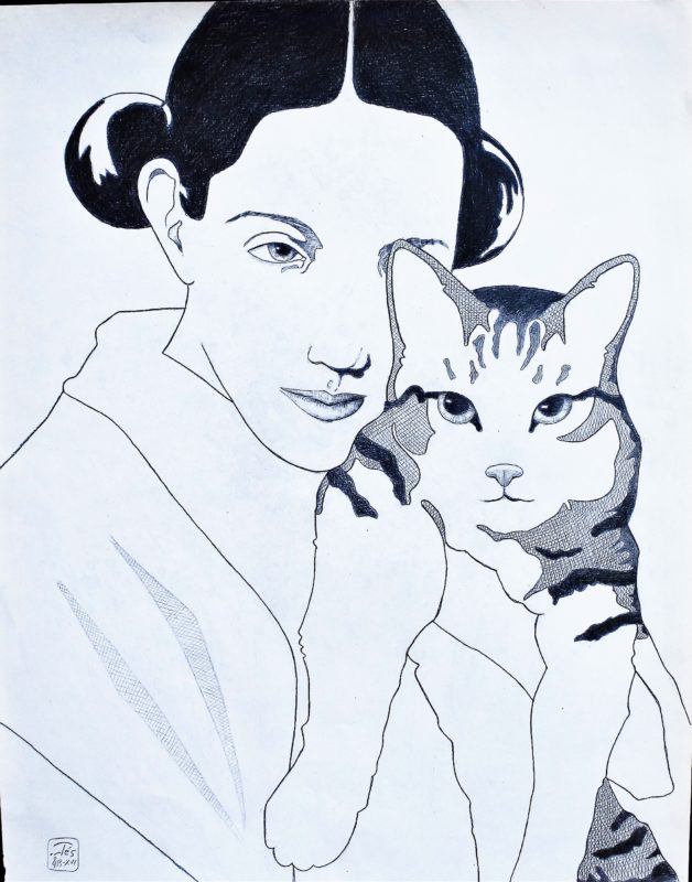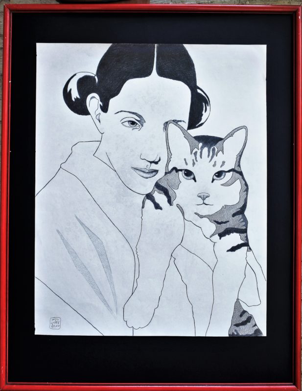 Luis V. Ortés, Mujer joven con su gato, dibujo grafito papel, enmarcado, dibujo 50×40 cms. y marco 67×52 cms.