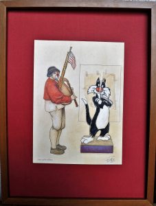 Luis V. Ortés, Presunto héroe, dibujo original técnica mixta y collage papel, enmarcado, dibujo 24×17,40 cms. y marco 40×30,50 cms.