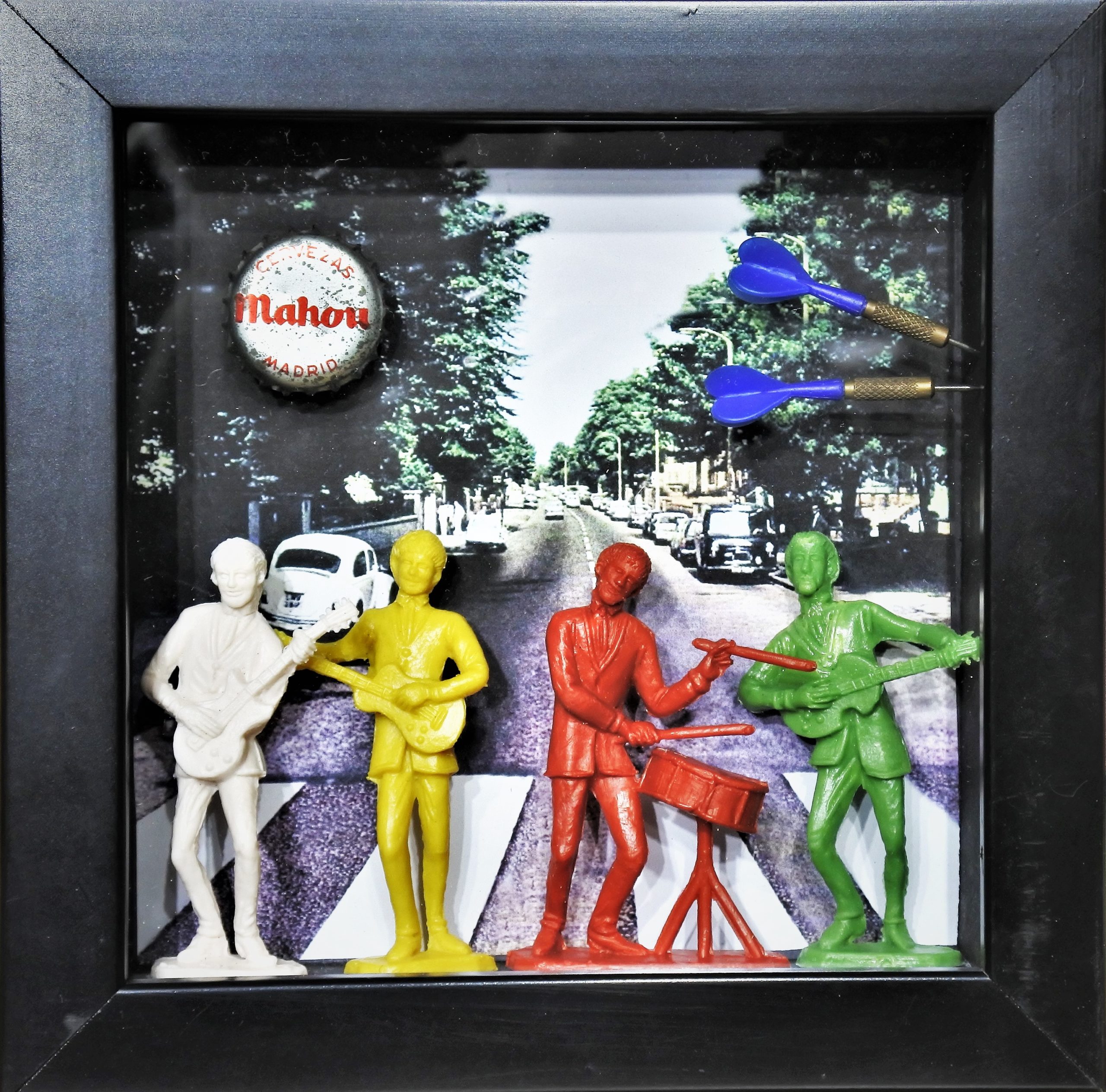 Ma. José Castillo, The Beatles, diorama, composición con collage objetos diversos, pieza única, con marco 19×19 cms.