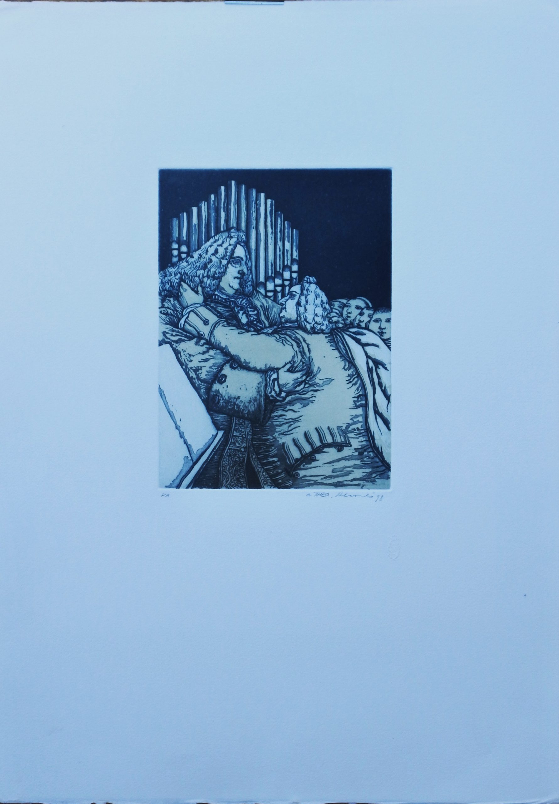 Manuel Alcorlo, Abrazo, grabado aguafuerte, numerado p.a., dedicado al editor y firmado a lápiz, plancha 21×15,50 cms. y papel 53×38 cms.