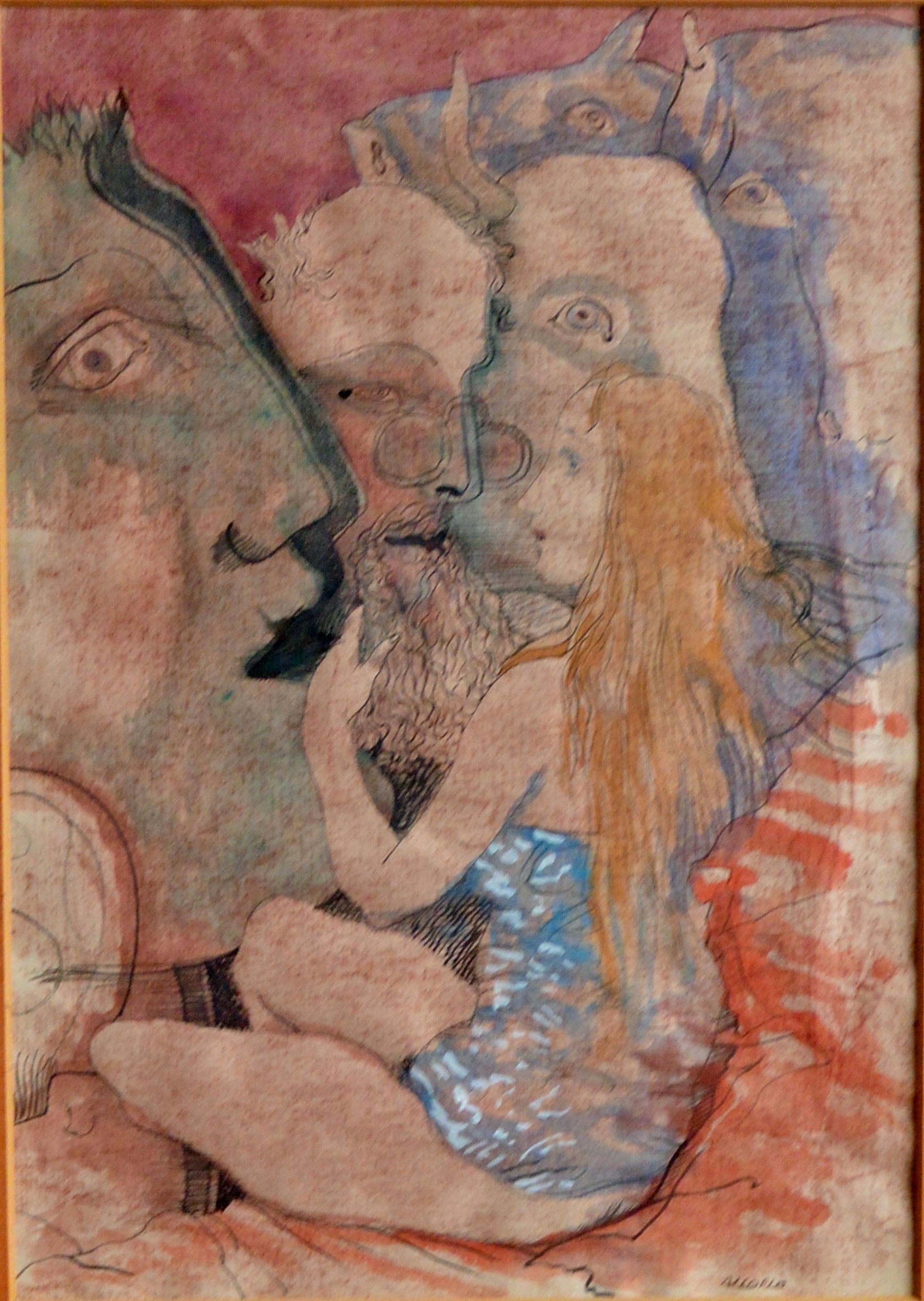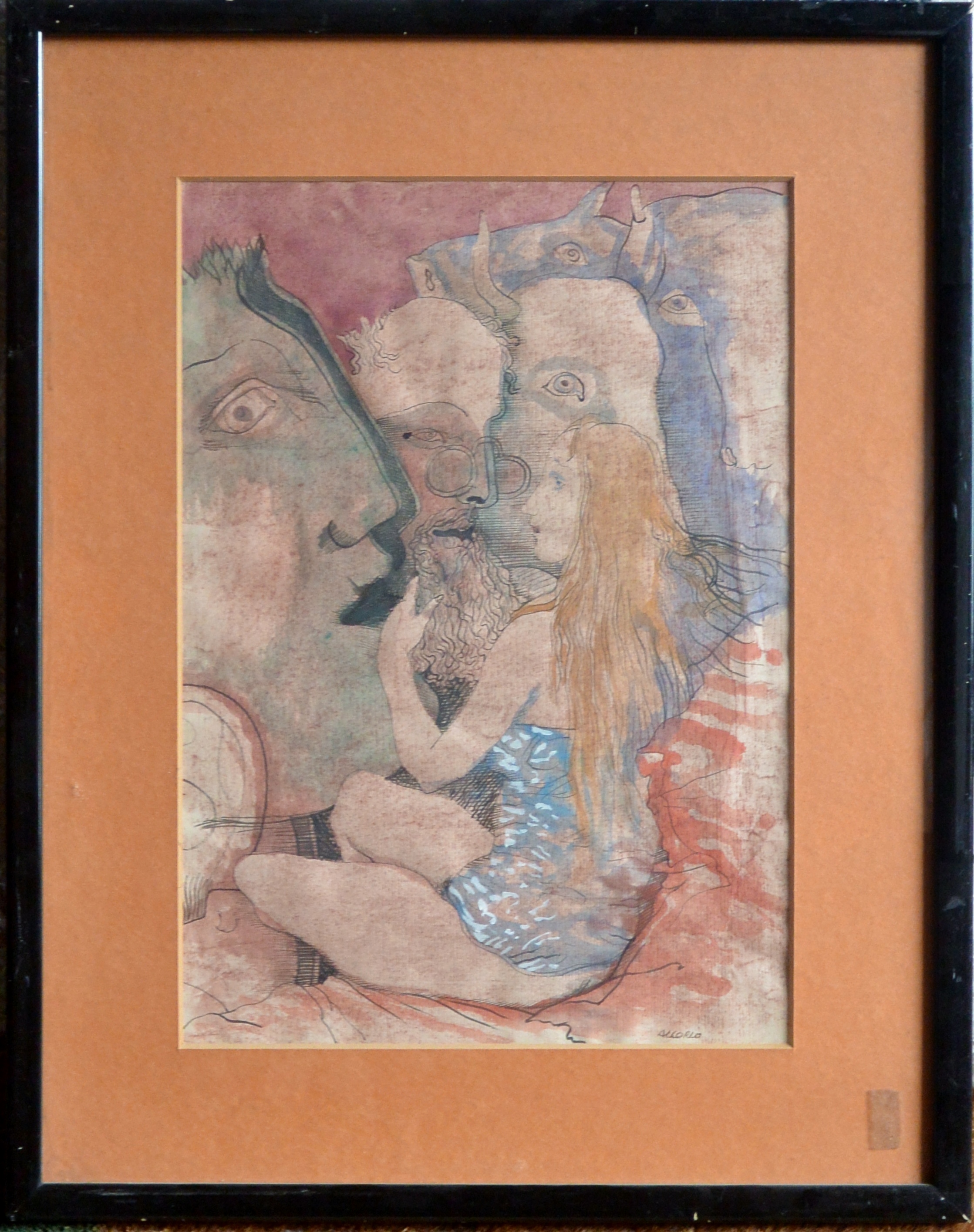 Manuel Alcorlo, Ante los gigantes, tinta y acuarela papel, enmarcado, dibujo 35×24,50 cms. y marco 48×38 cms.