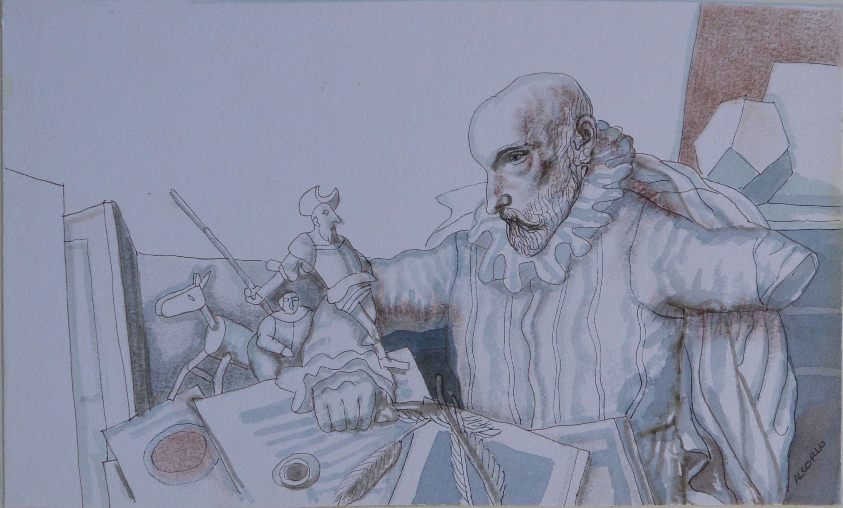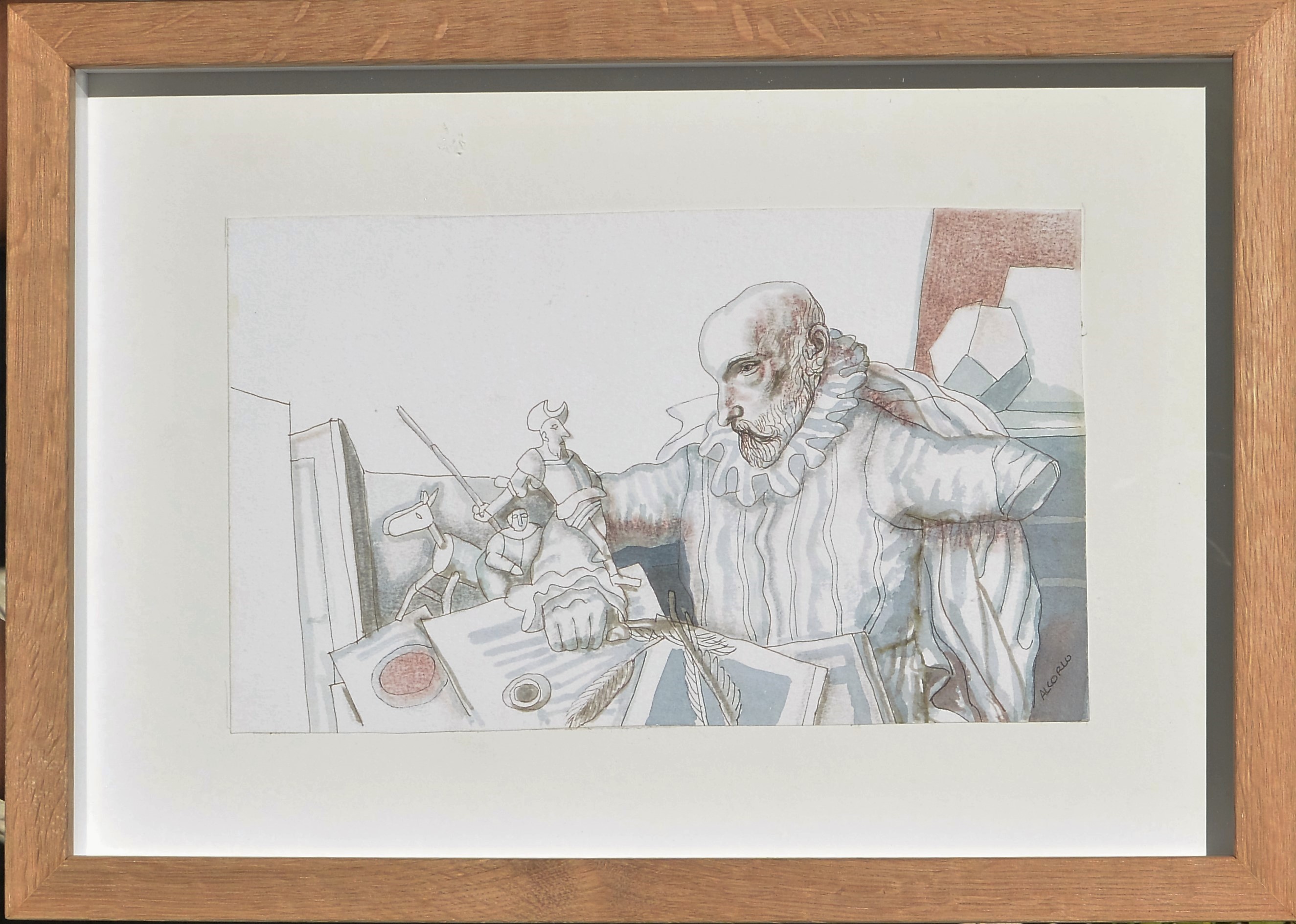 Manuel Alcorlo, Cervantes y sus personajes, dibujo técnica mixta cartulina, enmarcado, dibujo 18×30 cms. y marco 44×31,50 cms.