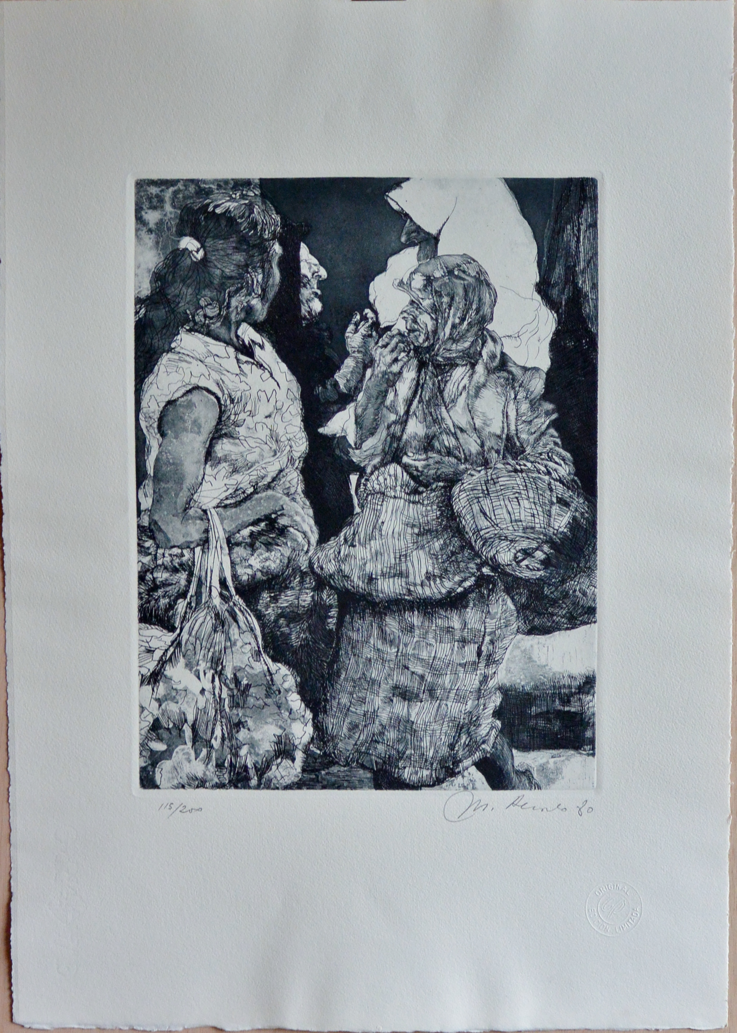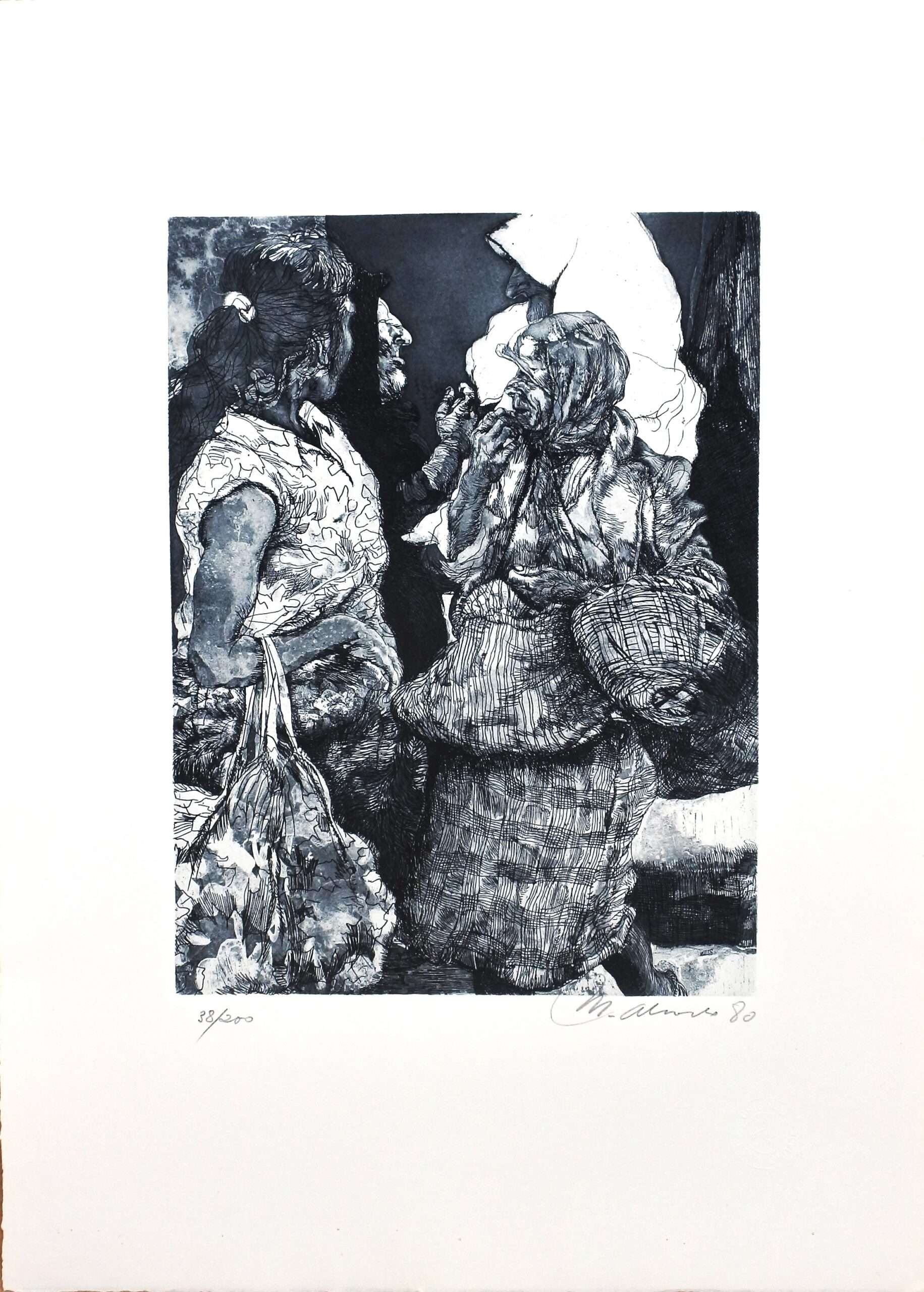 Manuel Alcorlo, Conversación, grabado, edición 200 ejemplares, numerado, datado y firmado a lápiz, huella 32×24 cms. y papel 54×38 cms.